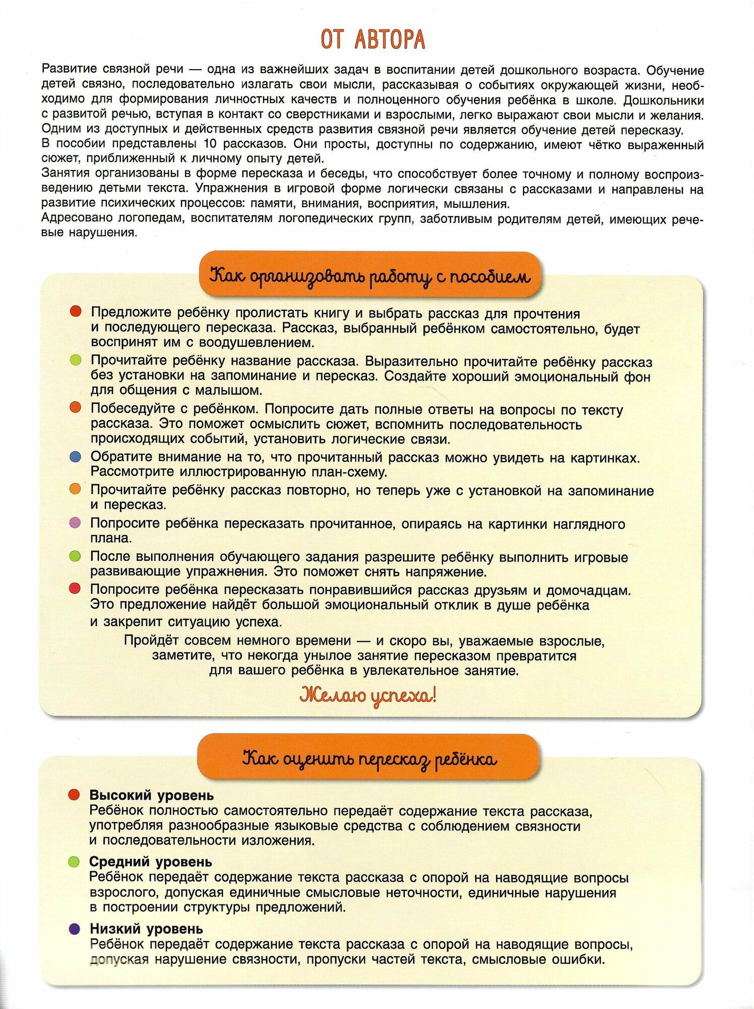 «Школа Натальи Теремковой» - это новый уникальный комплект материалов, разработанный известным логопедом-практиком. Поможет педагогам организовать занятия с детьми в игровой форме, а родителям - закрепить результат самостоятельно. Развитие связанной речи - одна из важнейших задач в воспитании детей дошкольного возраста. Обучение детей связно, последовательно излагать свои мысли, рассказывая о событиях окружающей жизни, необходимо для формирования личностных качеств и полноценного обучения ребенка в школе. Дошкольники с развитой речью, вступая в контакт со сверстниками и взрослыми, легко выражают свои мысли и желания. Одним из доступных и действенных средств развития связной речи является обучение детей пересказу. В пособии представлены 10 рассказов. Они просты, доступны по содержанию, имеют четко выраженный сюжет, приближенный к личному опыту детей. Занятия организованы в форме пересказа и беседы, что способствует более точному и полному воспроизведению детьми текста. Упражнения в игровой форме логически связаны с рассказами и направлены на развитие психических процессов: памяти, внимания, восприятия, мышления. Адресовано логопедам, воспитателям логопедических групп, заботливым родителям детей, имеющих речевые нарушения. Тетрадь «ПЕРЕСКАЗКИ на логопедических занятиях и не только...» это: первая тетрадь в комплекте - занятия на весь учебный год! 10 историй для пересказа. Рисунки и схемы для вопросов и бесед. Раскраски и смысловые наклейки. Игровые задания: «Пройди лабиринт», «Найди отличия», «Сгруппируй по признаку» и другие. Занятия в виде обсуждения и игры: составить рассказ по картинкам, выполнить задания, раскрасить картинки и дополнить их наклейками.