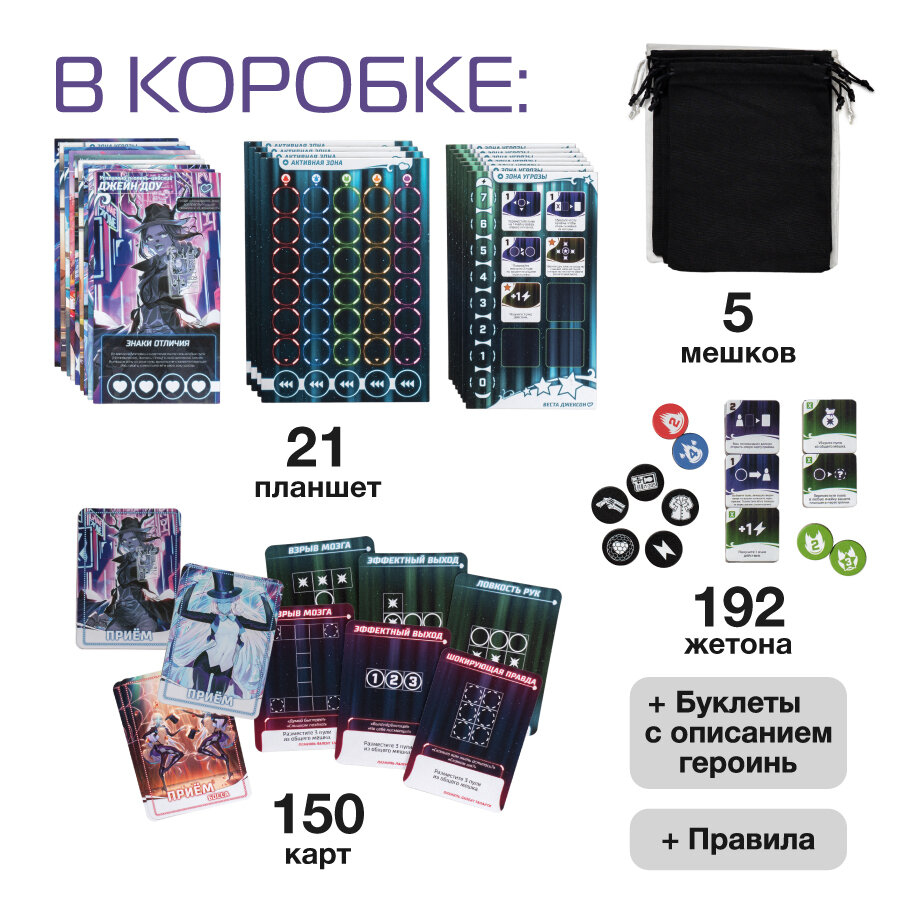 | Комплектация | 8 планшетов героинь; 4 планшета перестрелки; 8 планшетов действий; 90 карт приёмов; 51 карта приёмов босса; 5 карт экстренных выпусков; 4 памятки; шкала накала; 5 маркеров; 5 жетонов щитов; 12 жетонов командных действий; 27 жетонов усилений; 3 специальных жетона Джейн Доу |