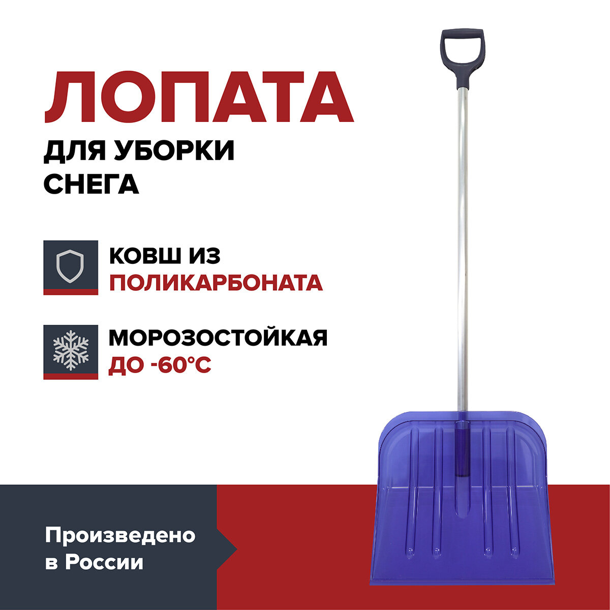 Ковш лопаты изготовлен из ударопрочного композитного материала и сохраняет свои свойства при температуре до -60°С. Режущая кромка оптимальной геометрии устойчива к истиранию и сколам, что позволяет использовать лопату для очистки поверхности от промерзшего и слежавшегося снега. Алюминиевый черенок диаметром 32 мм не подвержен коррозии. Эргономичная D-образная ручка обеспечивает правильный упор. Поликарбонатная лопата подходит для работы с сыпучими материалами: песком, гравием, зерном.