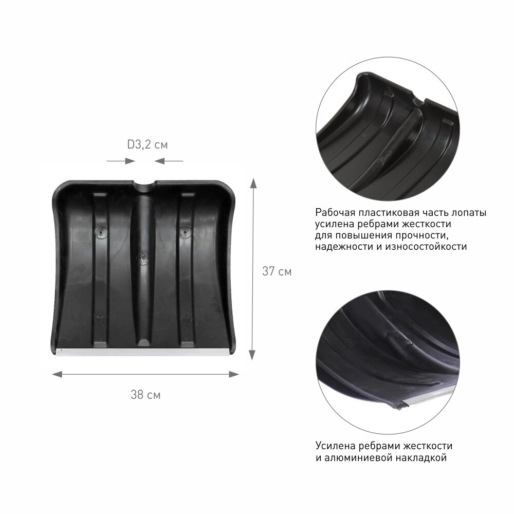 Предназначена для уборки снега. Материал: пластик, алюминий (полипропилен с добавлением морозоустойчивых компонентов).