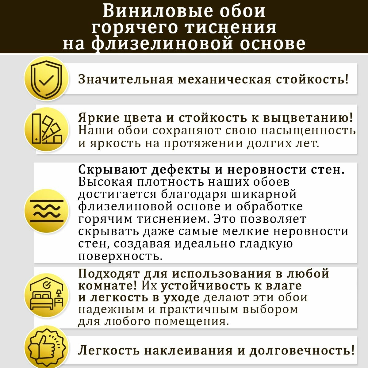 Вы ищете идеальный способ преобразить ваш дом или офис? Наши виниловые обои горячего тиснения - это именно то, что вам нужно! Наш продукт обладает рядом уникальных преимуществ, которые делают его непревзойденным в мире декора. Легкость наклеивания и долговечность! Одним из основных преимуществ наших обоев является их невероятная простота в использовании. Даже если вы новичок в ремонте, вы справитесь с ними без труда. Наши обои легко наклеиваются и снимаются без остатка, позволяя вам изменять интерьер вашего дома или офиса в любое время. Это идеальное решение для тех, кто ценит удобство и эффективность.Яркие цвета и стойкость к выцветанию! Наши обои сохраняют свою насыщенность и яркость на протяжении долгих лет благодаря устойчивости к выцветанию и потере пигмента. Ваш интерьер будет всегда выглядеть так же привлекательно, как и в первый день.Совершенное скрытие неровностей стен! Высокая плотность наших обоев достигается благодаря шикарной флизелиновой основе и обработке горячим тиснением. Это позволяет скрывать даже самые мелкие неровности стен, создавая идеально гладкую поверхность. Ваш дом будет сиять совершенством.Идеально подходят для любых помещений! Подходят для использования в любой комнате, включая гостиную, кабинет, спальню, прихожую, кухню, детскую и комнату подростка. Их устойчивость к влаге и легкость в уходе делают эти обои надежным и практичным выбором для любого помещения.Создайте уют и комфорт в любой комнате!Эти обои сделают ваш интерьер неповторимым в любой комнате: в спальне, в гостиной, коридоре или в ванной. Они создадут уютную атмосферу, в которой вам захочется проводить больше времени.Не упустите шанс преобразить ваш дом или офис с помощью наших качественных обоев! Разнообразие цветов и дизайнов позволит вам выбрать именно то, что подходит вам. Создайте красоту в каждой детали вашего пространства с нашими обоями!