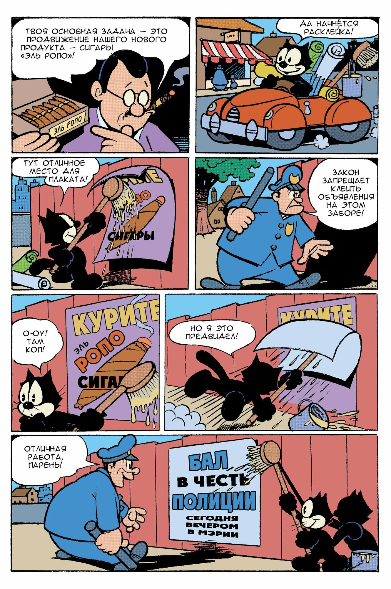 К середине 20-х годов Кот Феликс завладел вниманием зрителей по всему миру, мультики про него смотрели в США, Европе, Азии и Южной Америке. В 1924 году в Англии мягкие игрушки Феликса обогнали по продажам самую известную игрушку того времени — Медвежонка Тедди. Мультфильмы про находчивого кота, который регулярно попадал в нелепые передряги, по известности можно было сравнить разве что с фильмами Чарли Чаплина. Но, как и фильмы Чаплина, немые похождения Феликса не смогли прижиться в новой эре звукового кино, интерес к персонажу постепенно угас. Приключения Феликса, нарисованные Отто Мессмером, продолжались на страницах комиксов. В эту антологию вошли сюжеты двух серий Pat Sullivan’s Felix the Cat от издательства Toby Press и Felix the Cat от Dell Publishing. Читайте впервые на русском!
