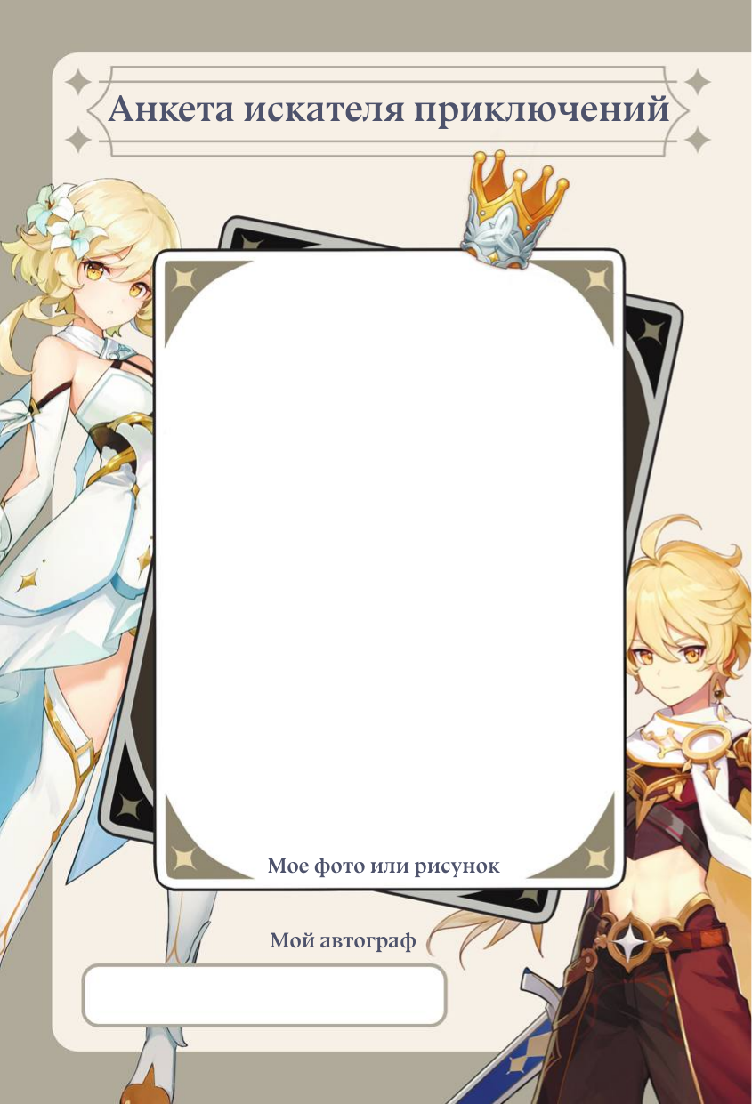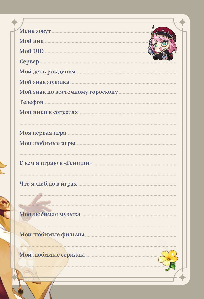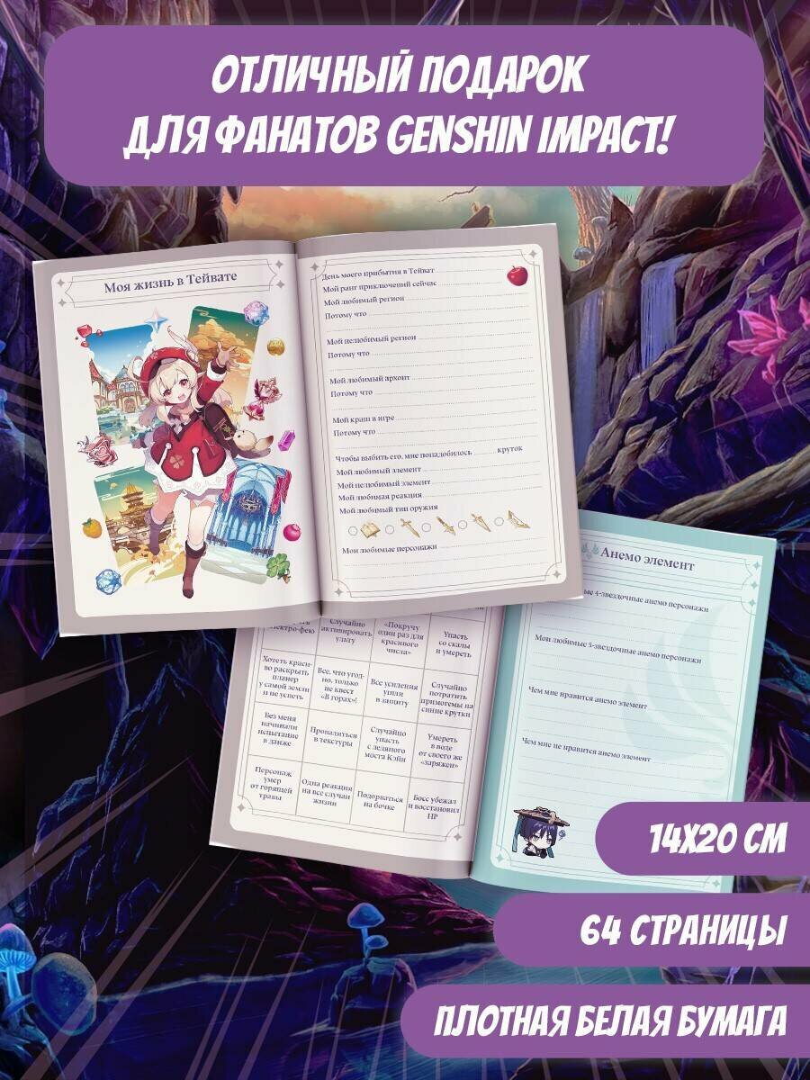 Идеальный фанбук для поклонников популярной игры «Genshin Impact»! В нем вы найдете анкету искателя приключений и странички для записей самых интересных моментов вашего путешествия по Тейвату; сможете увидеть, чего уже достигли, и вспомнить начало своего пути. Отвечайте на интересные вопросы по игре, заполняйте бинго, давайте волю своей фантазии на страничках для скетчей и превратите эту книгу в самый настоящий дневник искателя приключений!