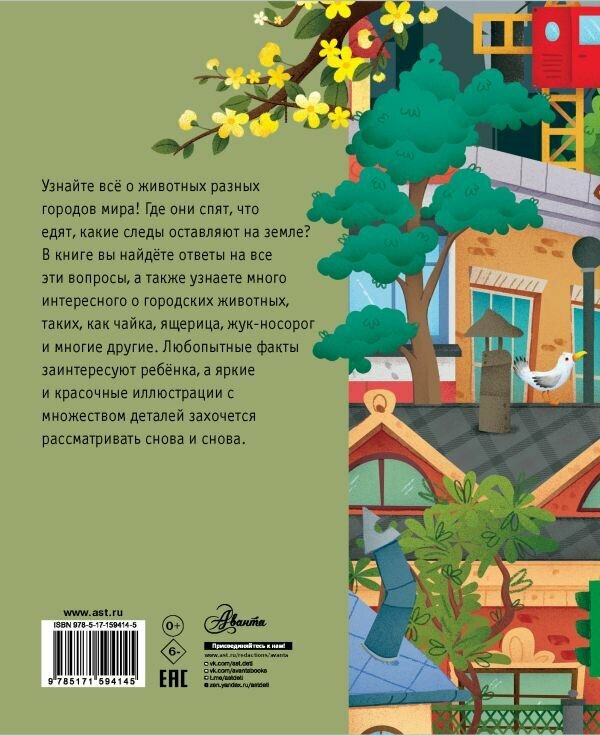 Эта книга познакомит малыша с животными и насекомыми, живущими в городах мира, расскажет, как они выглядят, чем питаются, где спят и какие следы оставляют на земле. Любопытные факты о животных заинтересуют ребёнка и сделают знакомство с городскими животными увлекательным и интересным. Великолепные иллюстрации Лауры Джорджи привлекут внимание малыша и позволят детально рассмотреть, как выглядит то или иное животное.