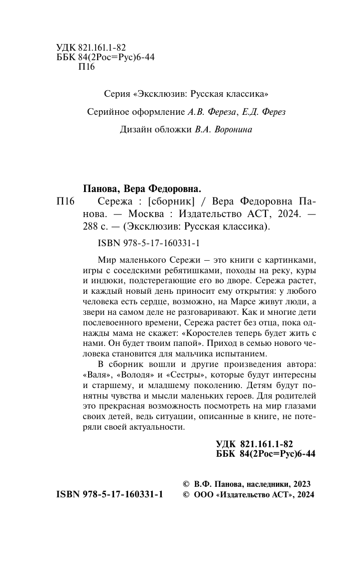 Книга: Сережа (Панова Вера Федоровна); АСТ, Neoclassic, 2024
