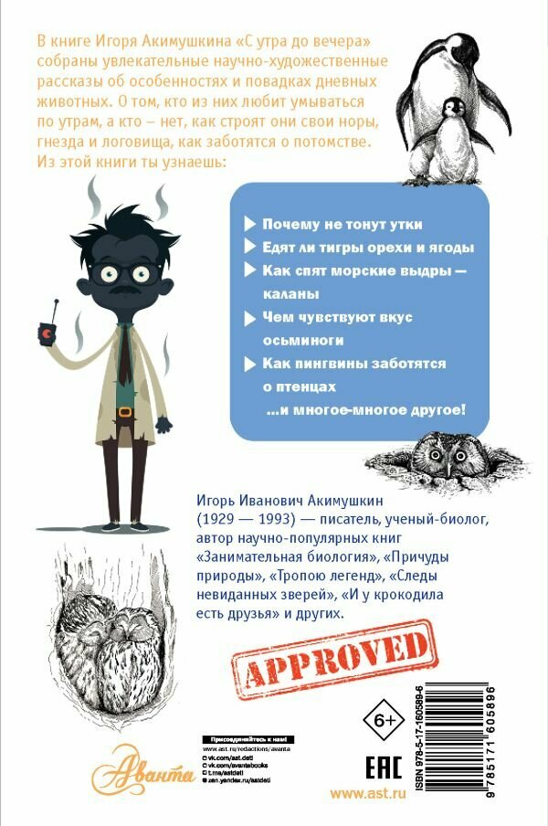 Как удивительны привычки и ежедневные ритуалы животных! Книга биолога и популяризатора науки для детей Игоря Ивановича Акимушкина "С утра до вечера" расскажет о многих из них. Вы узнаете, кто из животных моргает всего раз в году, кто может не есть месяцами, кто пьет морскую воду без вреда для здоровья, почему зверям важно играть друг с другом, как животные и птицы лечатся от болезней, какие животные — самые нерадивые родители, правда ли, что стрижи могут спать во время полета, и видят ли слоны и шимпанзе сны. Жизнь дневных животных отражена в книге "С утра до вечера". А другая книга Игоря Акимушкина, "С вечера до утра", поведает о повадках ночных животных и птиц. Еще более загадочных, так как мы редко их наблюдаем воочию, и не менее интересных!