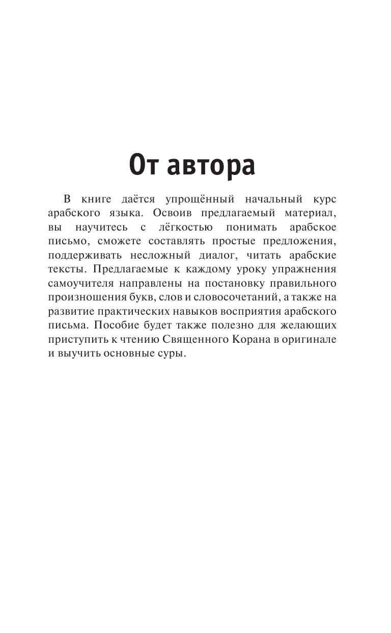 В данном пособии вы найдете все необходимое для изучения арабского языка: правила чтения и произношения, ключевые грамматические темы, а также основные характеристики категорий глагола и важную лексику для общения. Каждый урок дополняется новыми словами, а для закрепления материала предлагаются упражнения с ключами, находящимися в конце книги. Пособие также содержит полезные приложения и русско-арабский словарь.