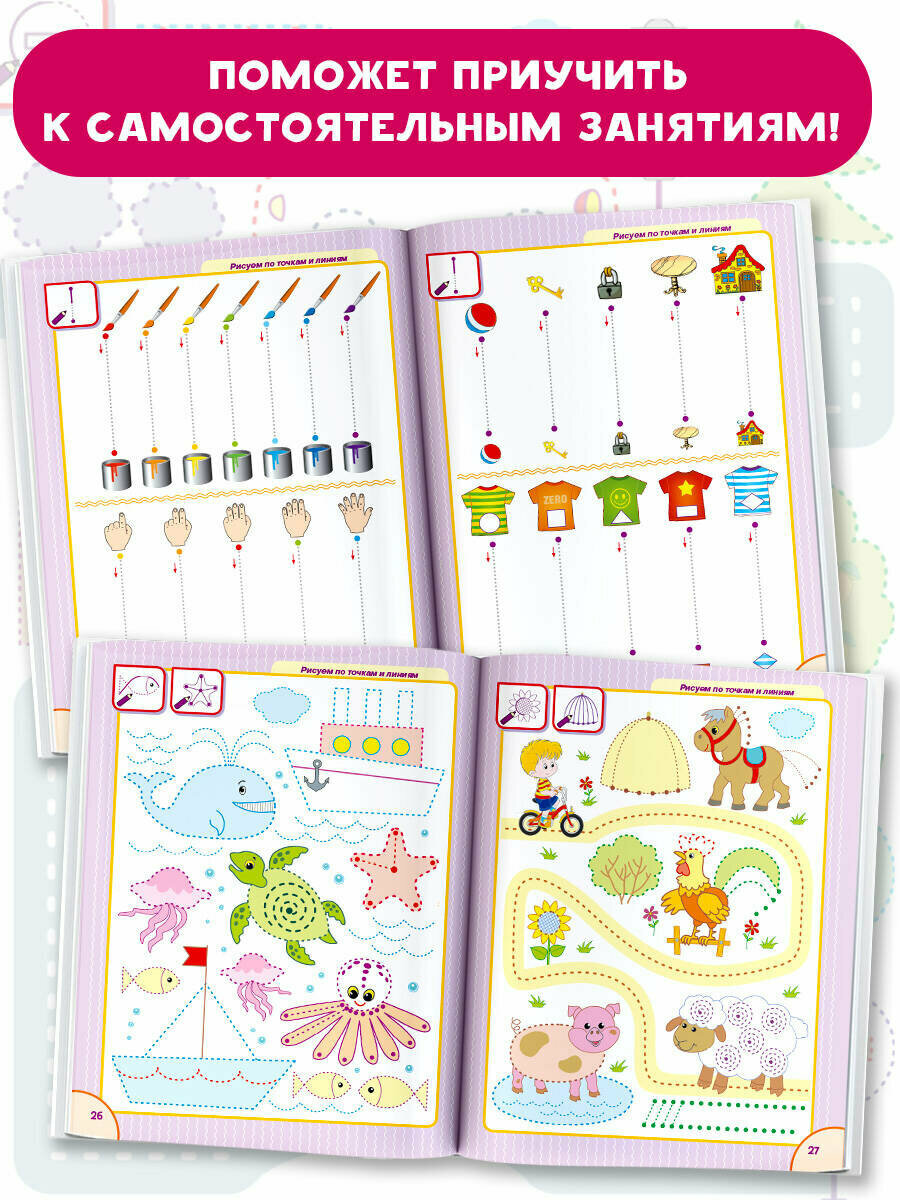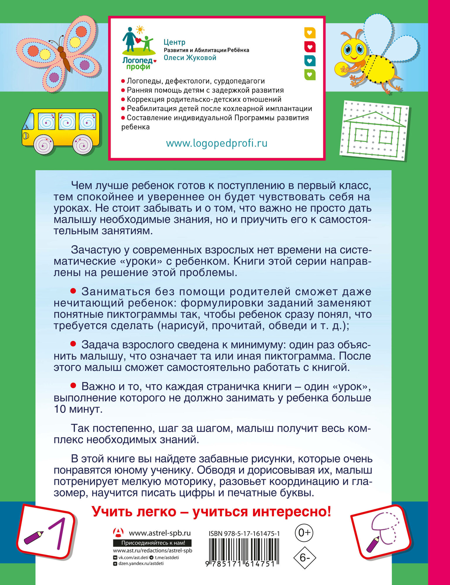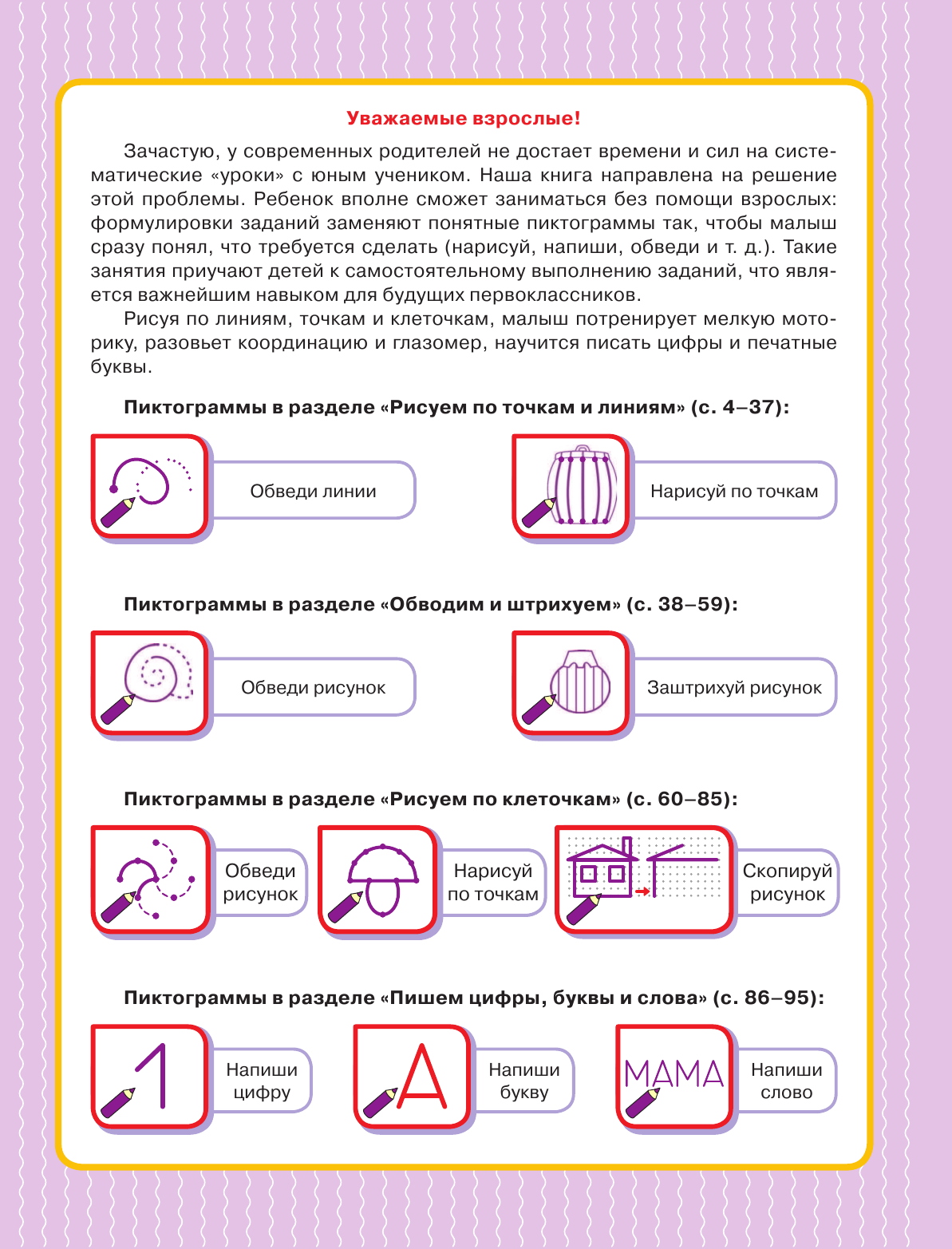 Книга создана специально для занятых родителей. Ребенок вполне сможет заниматься без помощи взрослых: формулировки заданий заменяют понятные пиктограммы так, чтобы малыш сразу понял, что требуется сделать (нарисуй, напиши, обведи и т. д.). Такие занятия приучают детей к самостоятельному выполнению заданий, что является важнейшим навыком для будущих первоклассников.