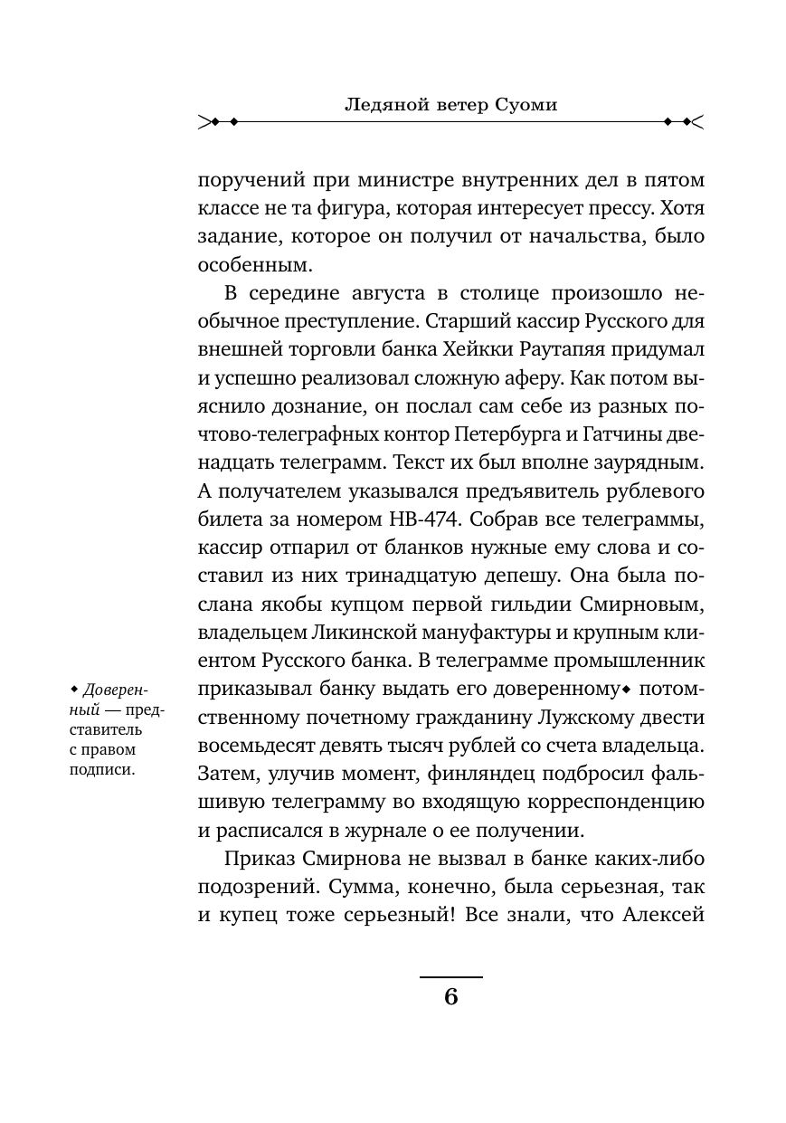 Немудрено, что кассир крупного банка, уроженец Финляндии Раутапяя, воспользовался таким удобным случаем. До финской границы — всего ничего. А там, в продуваемом ледяными ветрами Гелсингфорсе, российская полиция бессильна. И всем заправляют местные блюстители порядка, для которых распоряжения имперских властей — пустой звук. Используя подложные документы, господин Раутапяя похитил почти триста тысяч рублей и был таков...