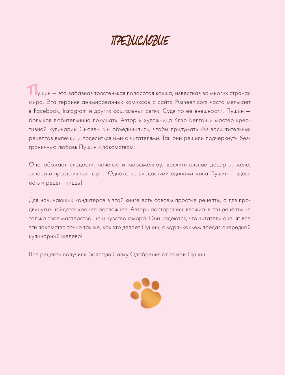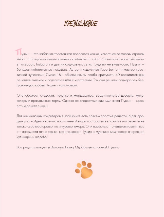 Автор и художница Клэр Белтон и мастер креативной кулинарии Сьюзен Ын объединились, чтобы придумать 40 восхитительных рецептов выпечки и поделиться ими с вами. Так они решили подчеркнуть безграничную любовь Пушин к лакомствам.