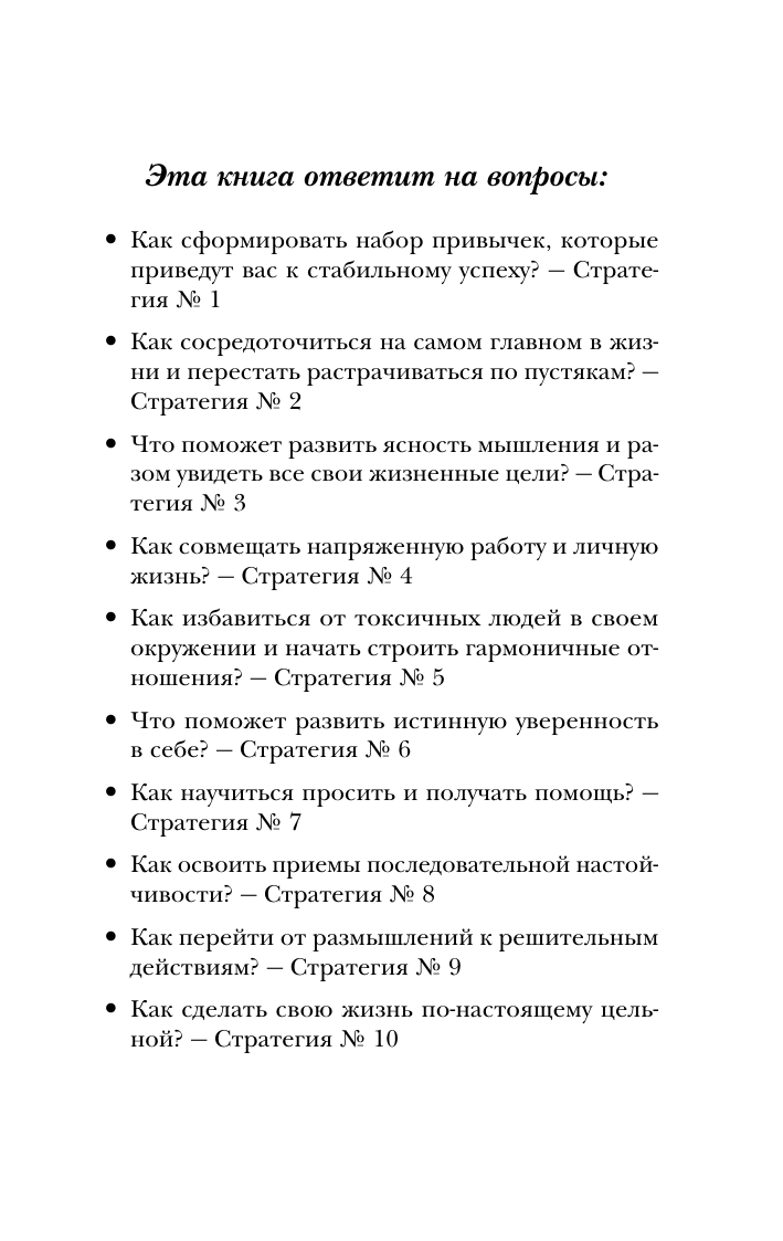 Редкий пример книги по саморазвитию, в которой нет ничего лишнего или бесполезного. Авторы подробно описывают 10 ключевых стратегий, которые не просто помогают достигать своих целей, — они делают жизнь комфортнее, счастливее и продуктивнее.