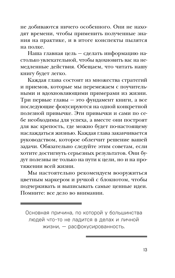«Ваше умение сосредоточиться на главном — самый важный навык для достижения успеха. Эта книга поможет вам развить его во всех сферах вашей жизни. Это что-то невероятное!» — Брайан Трейси, мотивационный спикер и консультант международного уровня, автор ряда бестселлеров