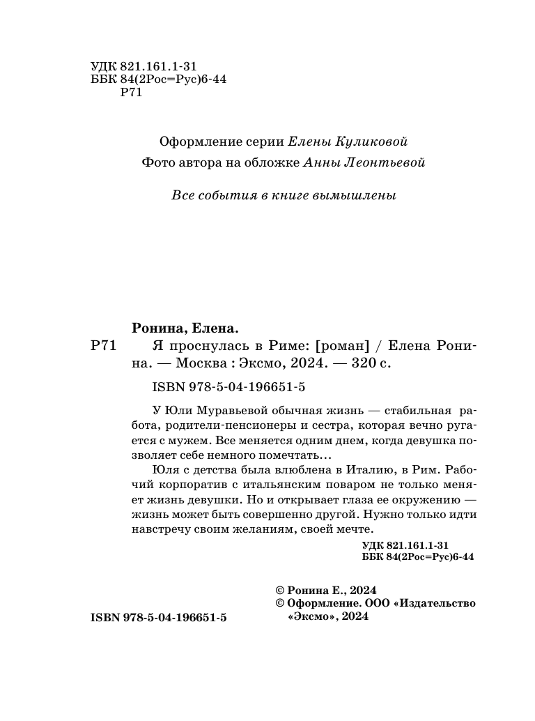 Книга: Я проснулась в Риме (Ронина Елена); ООО "Издательство "Эксмо", 2024