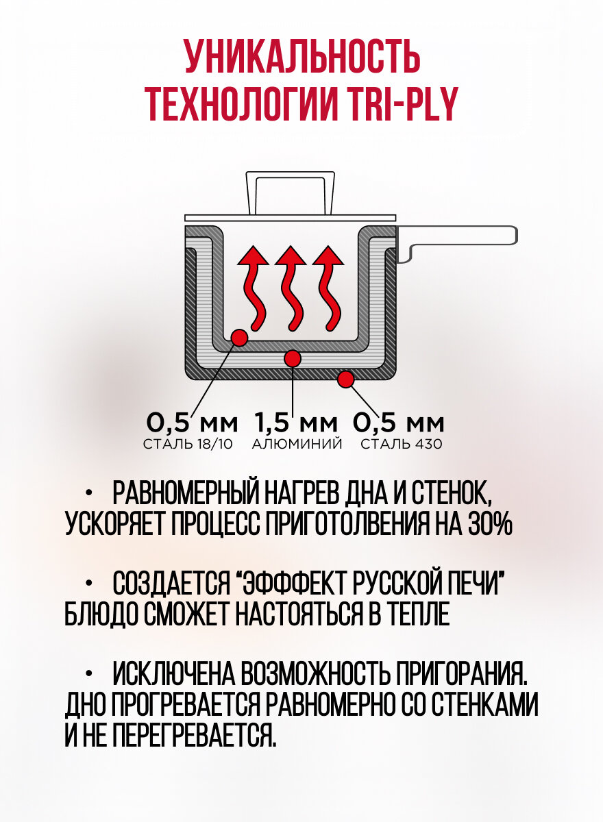 Технология монолитного корпуса TriPly - , трехслойная структура дна и стенок : посуда не имеет швов и соединений. Изнутри и снаружи слой из нержавеющей стали , а между ними слой алюминия. Равномерная тепловая обработка происходит со всех сторон, нет необходимости перегревать дно, для того чтобы ускорить процесс приготовления. Тепловая обработка продукта происходит равномерно по всей поверхности посуды. Экономит время приготовления пищи до 30%
