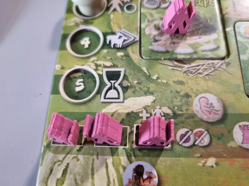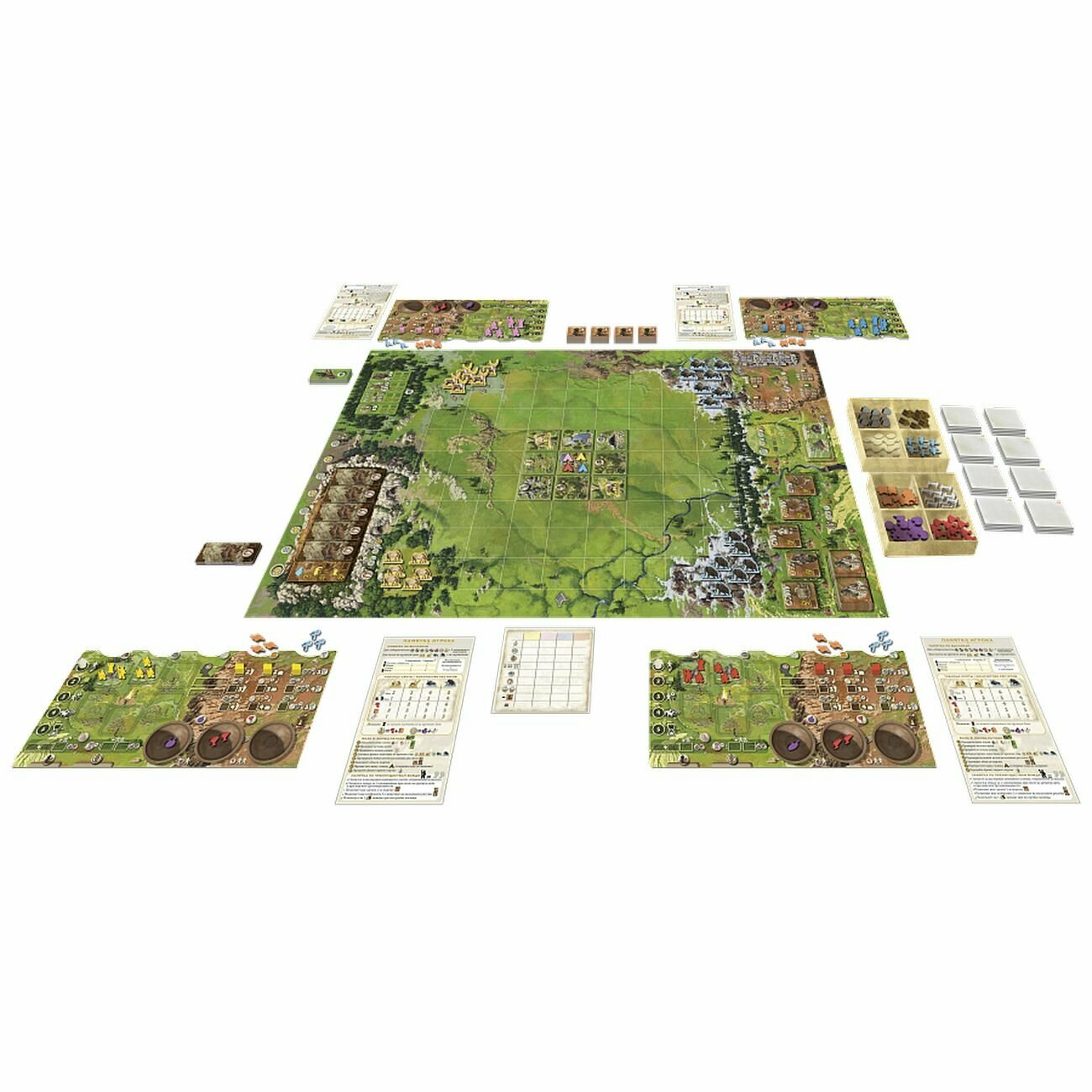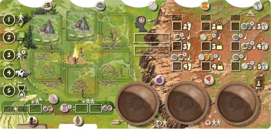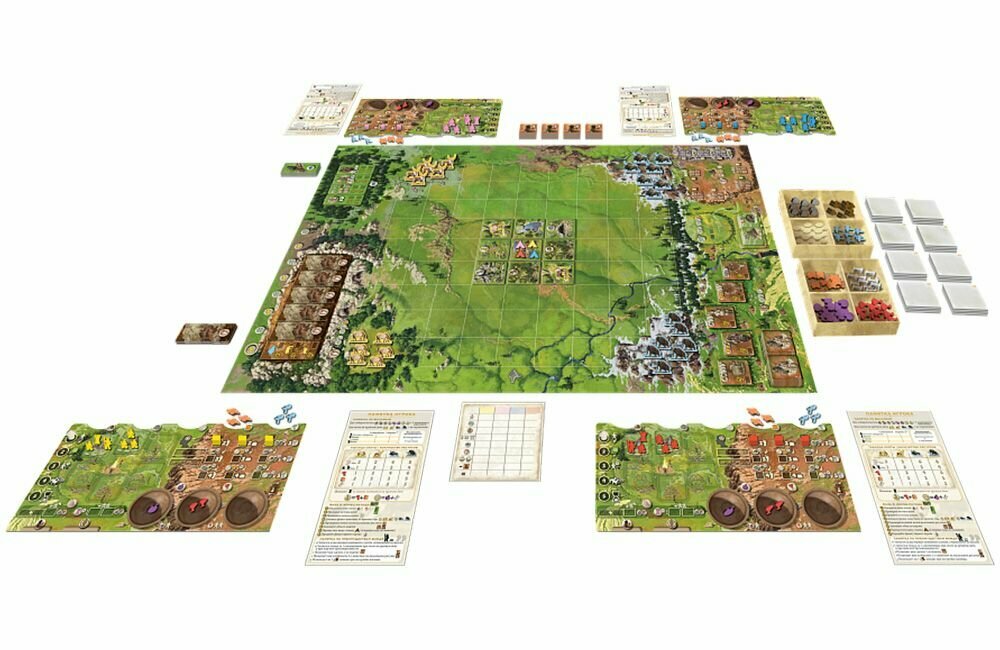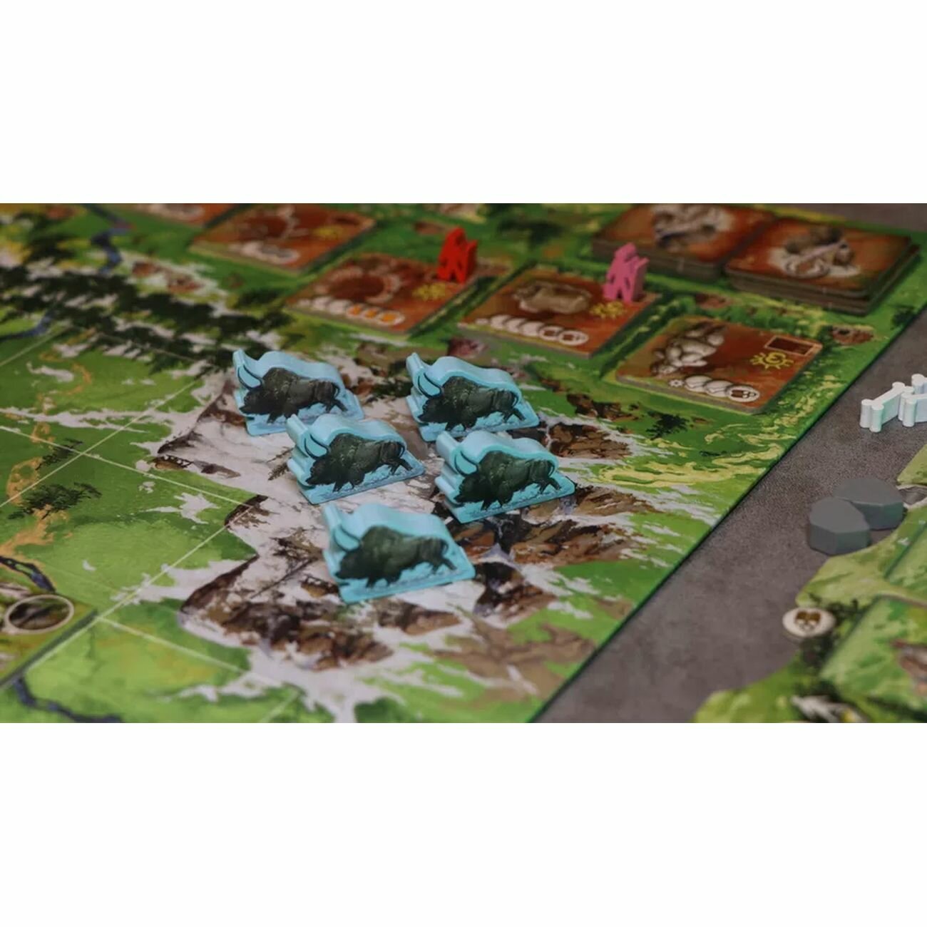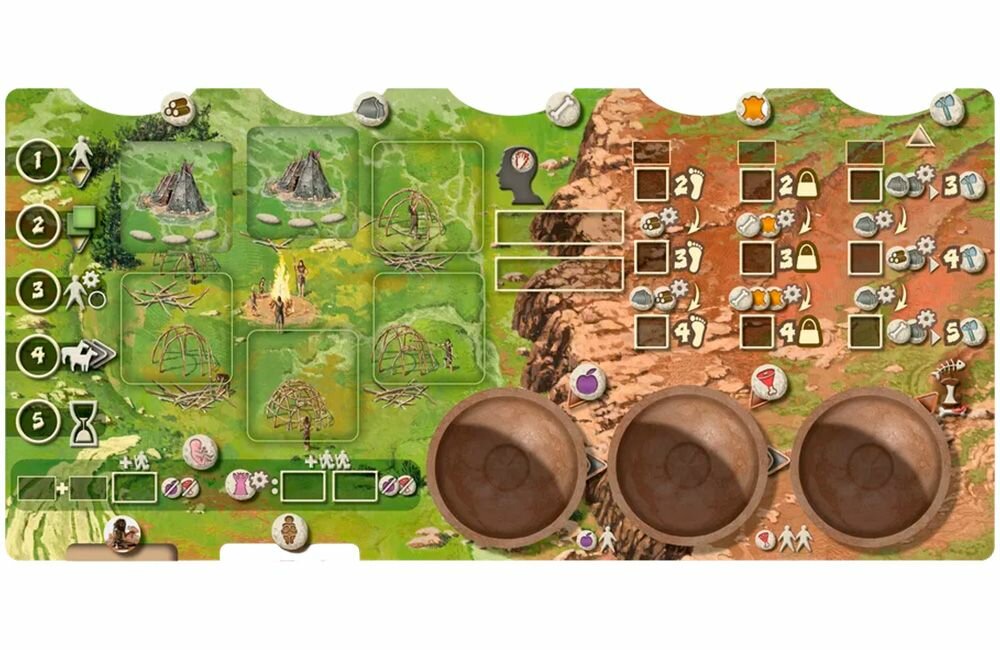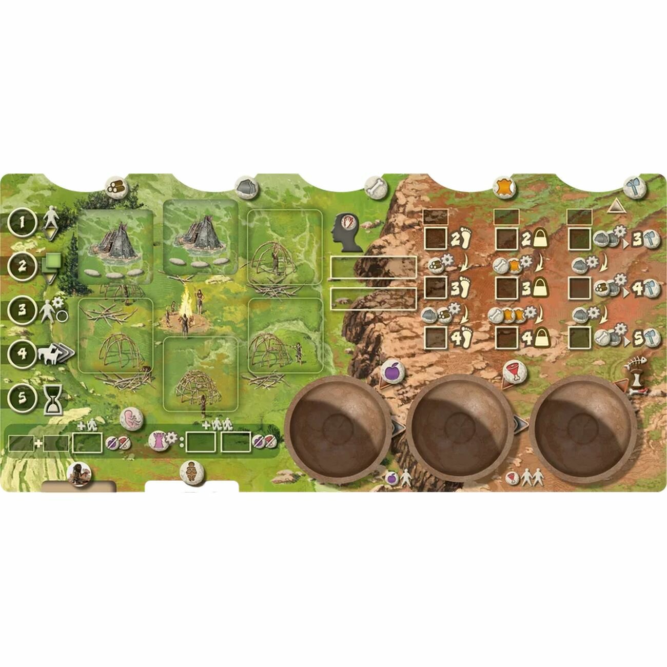 | Комплектация | 1 двухстороннее игровое поле; 9 стартовых жетонов; 60 жетонов местности; 24 жетона жилищ; 18 жетонов поделок; 12 жетонов наскальных рисунков; 8 жетонов целей; 24 жетона лишений; 210 фигурок и ресурсов; Хижина первого игрока; Кольцо раундов; Стрелка приоритета миграции; 54 жетона истощения; 28 фигурок животных (лошади, олени, бизоны, мамонты); 4 двусторонних планшета племени; 4 фигурки стоянок; 48 фигурок соплеменников (вождь, шаман, охотники-собиратели); 8 жетонов шаманов; 12 фигурок мегалитов; 80 кубиков; 4 памятки; Блокнот для подсчета очков; 2 лотка для хранения компонентов; 30 карточек для соло-режима; 11 жетонов целей для солорежима; Накладка действий шамана для соло-режима; 2 белых фигурки соплеменников; Правила игры на иностранном языке |