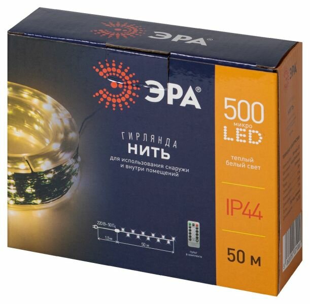 50м. Новогодняя гирлянда нить теплый свет Эра ENIN-500G 500LED IP44 220В (Б0060428) ENIN500G нить, теплый свет, 50 м, 500 microLED, IP44, 220В