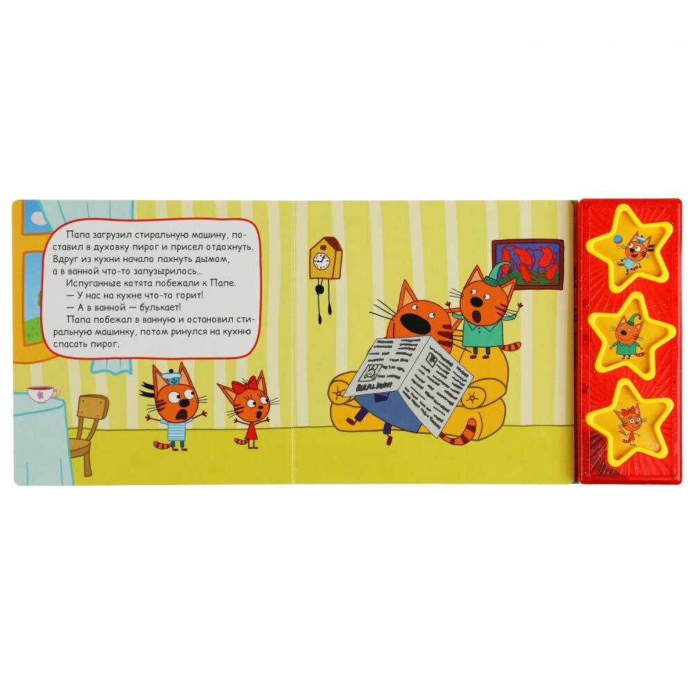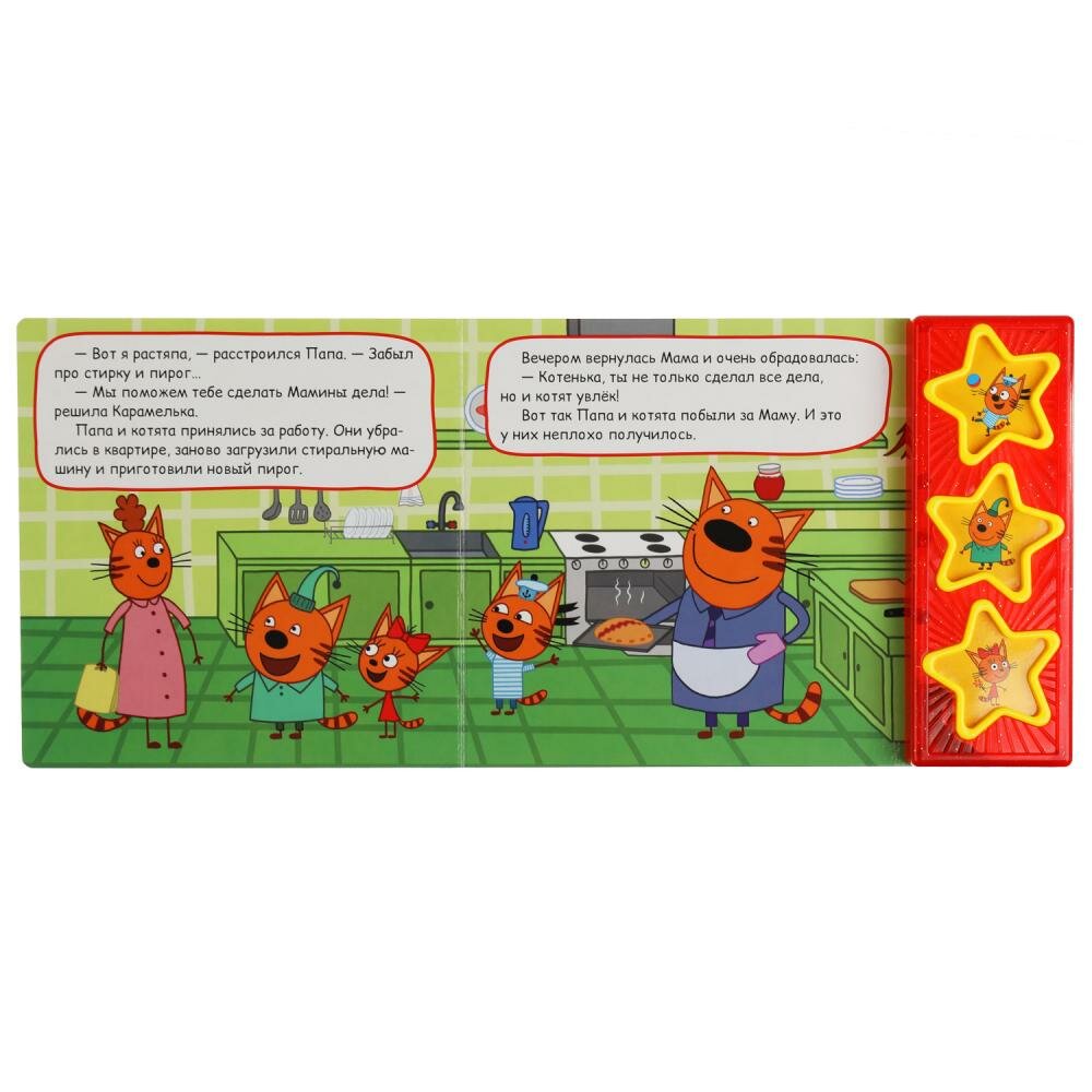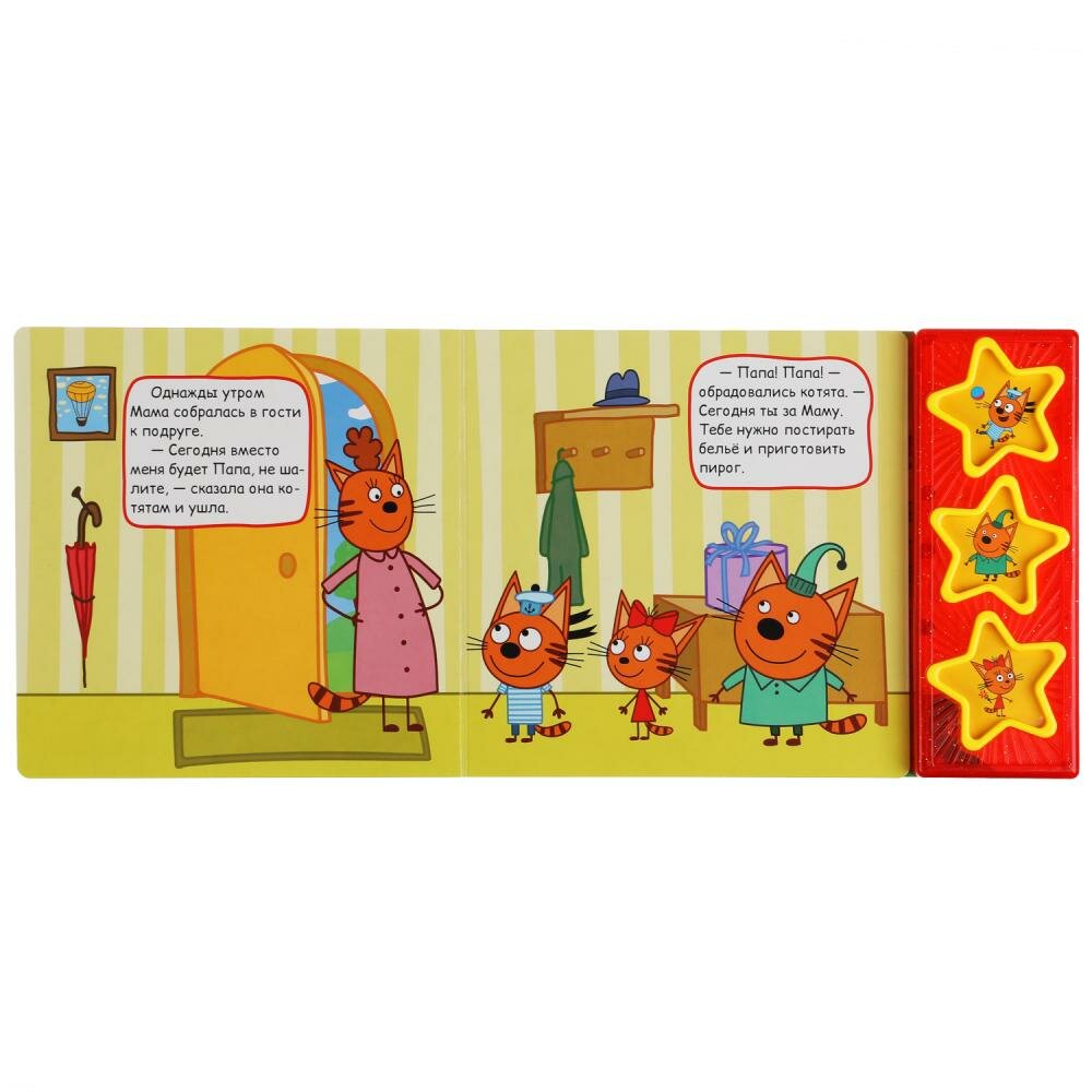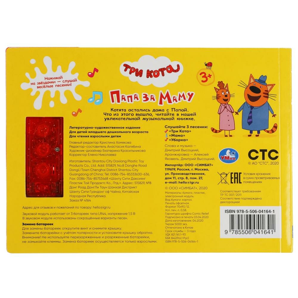 Музыкальная книга «Три кота. Папа за маму» ТМ «УМка» станет прекрасным подарком для маленьких поклонников известного мультсериала про весёлых и любознательных котят. Ребёнок с удовольствием будет листать плотные страницы, рассматривать яркие картинки, вместе с родителями читать про приключения любимых персонажей и, конечно, нажимать на кнопки и слушать весёлые песенки. Малыш легко освоит включение звука: по нажатию на кнопку песенка включится, при втором нажатии выключится. Благодаря компактному размеру книгу удобно взять с собой в дорогу.