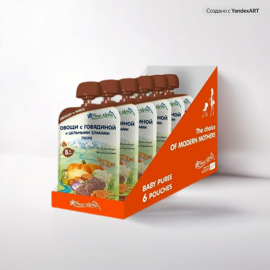 Уникальное сочетание 6 овощей, диетического мяса говядины и цельных злаков понравится малышу. Пюре обладает нежным сбалансированным вкусом, в котором хорошо чувствуются и овощи, и мясо. Оно имеет оптимальную, в меру густую консистенцию и чистый состав без соли, без специй и без крахмала. Пюре в пауче Fleur Alpine с овощами, мясом и цельными злаками удобно брать с собой на прогулку или в поездку.
