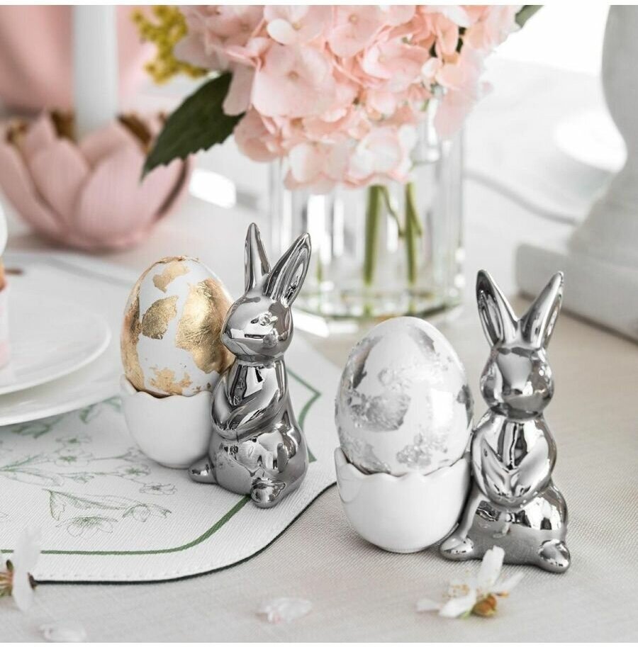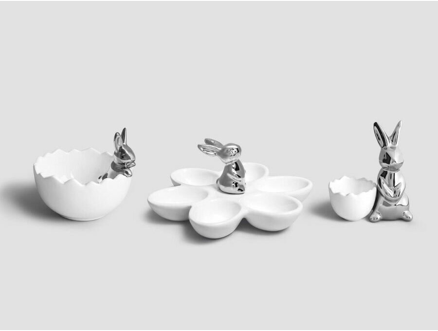 Изящная небольшая фарфоровая подставка входит в пасхальную коллекцию декора для дома от Togas.«Фальбер» изготовлена из белоснежного фарфора. Несмотря на свою видимую хрупкость, фарфор намного прочнее других видов керамики. Он практически не меняется спустя долгое время: не тускнеет, сохраняет свою белизну и блеск.«Фальбер» – подставка для одного яйца, ее удобно использовать не только для праздничного стола, но и для ежедневных завтраков. Это красивое изделие с симпатичным серебристым зайчиком понравится детям.