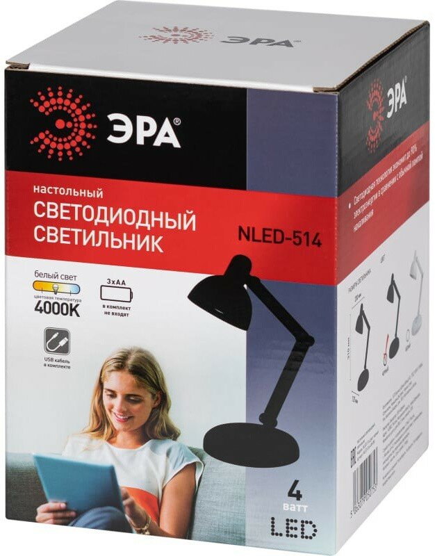 Настольный светильникNLED-514-4W-BK со светодиодами (LED) в качестве источников света. Работает от элементов 3 х АА (не входят в комплект поставки) или от USB.