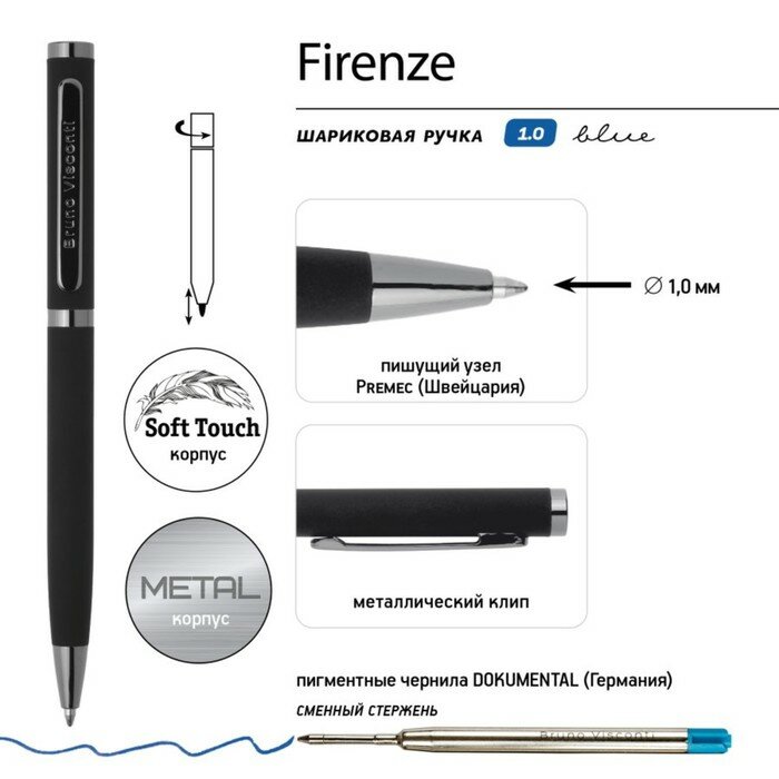 Шариковая металлическая ручка из коллекции FIRENZE от Bruno Visconti - бизнес-аксессуар, с которым вы всегда будете чувствовать себя уверенно и комфортно.Лаконичный дизайн, прочный металлический корпус, строгость формы подчеркнут статус владельца ручки. Удобство в эксплуатации и тактильно приятные ощущения подарит бархатистое покрытие Soft Touch.Ручка автоматическая, с легким поворотным механизмом подачи стержня. Надежный пишущий узел d 1.0 мм (от швейцарского производителя Premec) гарантирует высокое качество так же, как и пигментные чернила Dokumental (Германия). Благодаря им писать ручкой FIRENZE одно удовольствие – она мягко скользит по поверхности бумаги, оставляя ровную, чёткую линию.Ручка в подарочном металлическом футляре-тубусе круглой формы – презентабельно, стильно, удобно. Отличная идея для подарка! Сменный стержень - арт.9632840