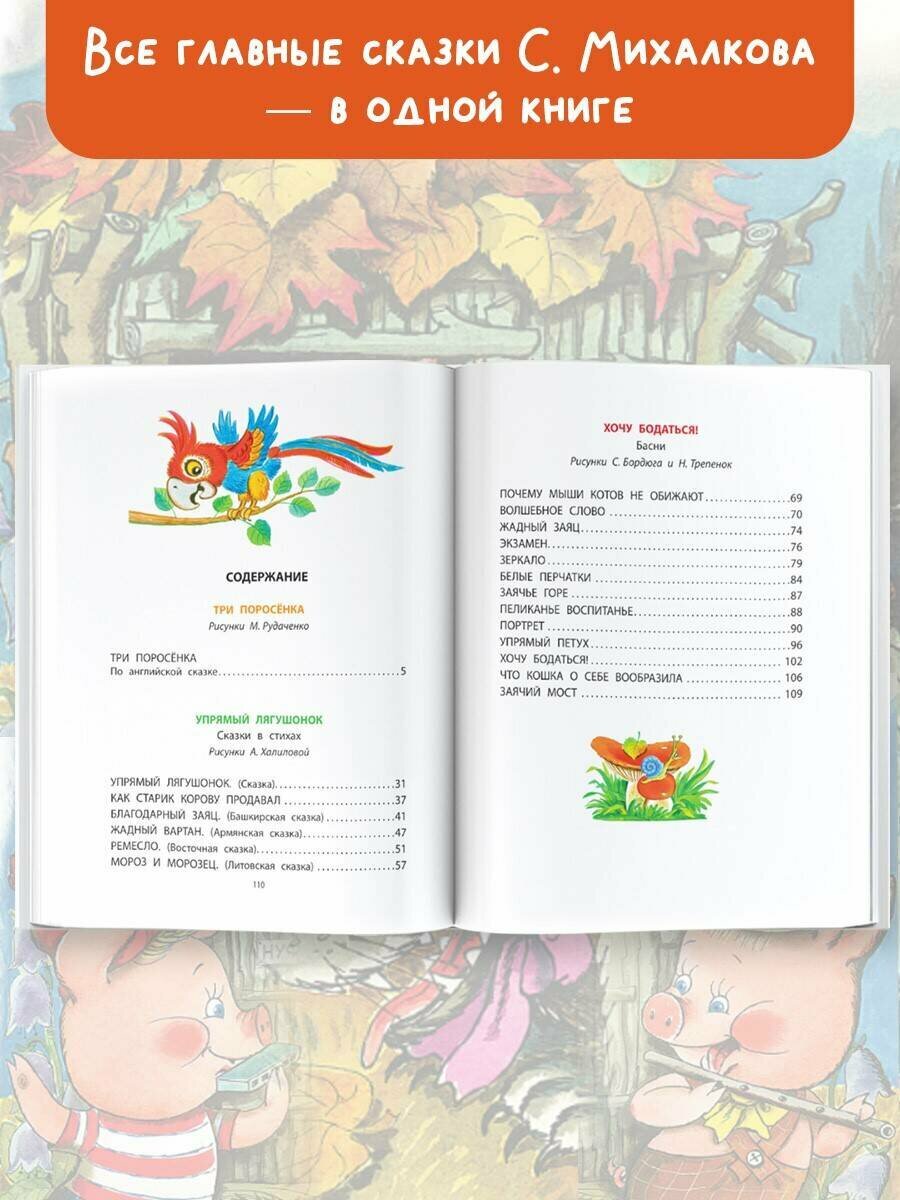 В сборник вошли двадцать сказок Сергея Михалкова — поэта, писателя, публициста, автора гимнов СССР и России. Ребята прочитают самые знаменитые сказки Сергея Михалкова для маленьких — «Три поросёнка», «Упрямый Лягушонок», «Как старик корову продавал», «Мороз и Морозец» и другие. Из них ребята узнают, как важно иметь прочный дом и слушаться взрослых, быть добрым и честным, не жадничать и помогать другим. Рисунки М. Рудаченко, А. Халиловой, С. Бордюга и Н. Трепенок.