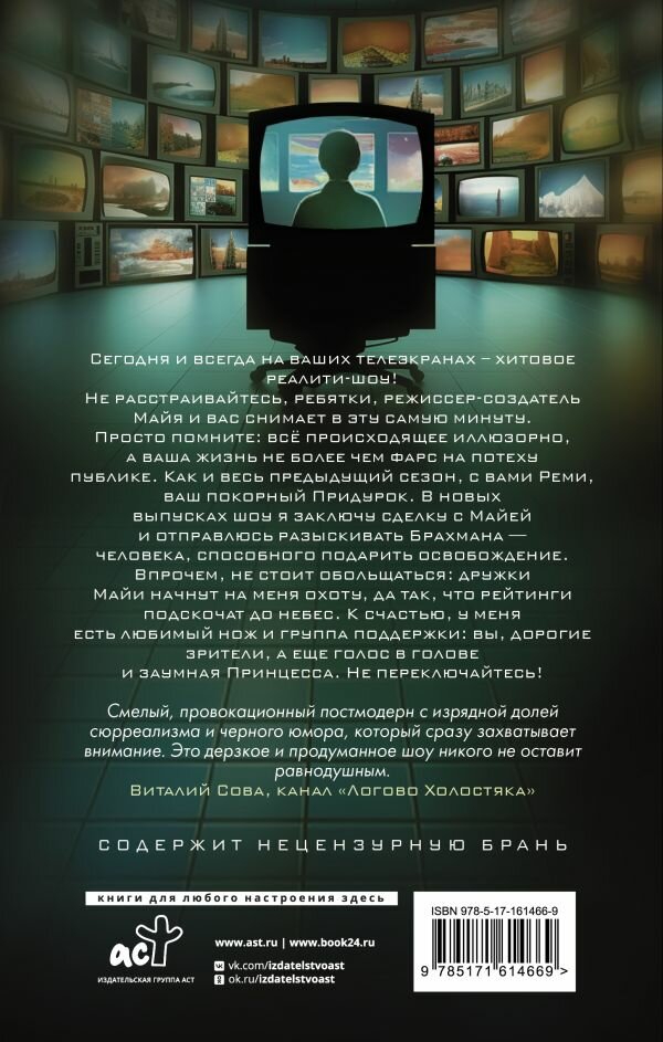 Не расстраивайтесь, ребятки, режиссер-создатель Майя и вас снимает в эту самую минуту. Просто помните: всё происходящее иллюзорно, а ваша жизнь не более чем фарс на потеху публике. Как и весь предыдущий сезон, с вами Реми, ваш покорный Придурок. В новых выпусках шоу я заключу сделку с Майей и отправлюсь разыскивать Брахмана — человека, способного подарить освобождение. Впрочем, не стоит обольщаться: дружки Майи начнут на меня охоту, да так, что рейтинги подскочат до небес. К счастью, у меня есть любимый нож и группа поддержки: вы, дорогие зрители, а еще голос в голове и заумная Принцесса. Не переключайтесь!