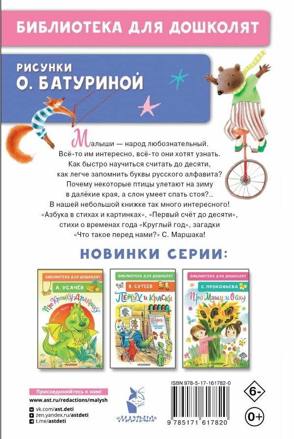 Малыши — народ любознательный. Всё-то им интересно, всё-то они хотят узнать. Как быстро научиться считать до десяти, как легче запомнить буквы русского алфавита? Почему некоторые птицы улетают на зиму в далёкие края, а слон умеет спать стоя?.. В нашей небольшой книжке так много интересного! «Азбука в стихах и картинках», «Первый счёт до десяти», стихи о временах года «Круглый год», загадки «Что такое перед нами?» С. Маршака!