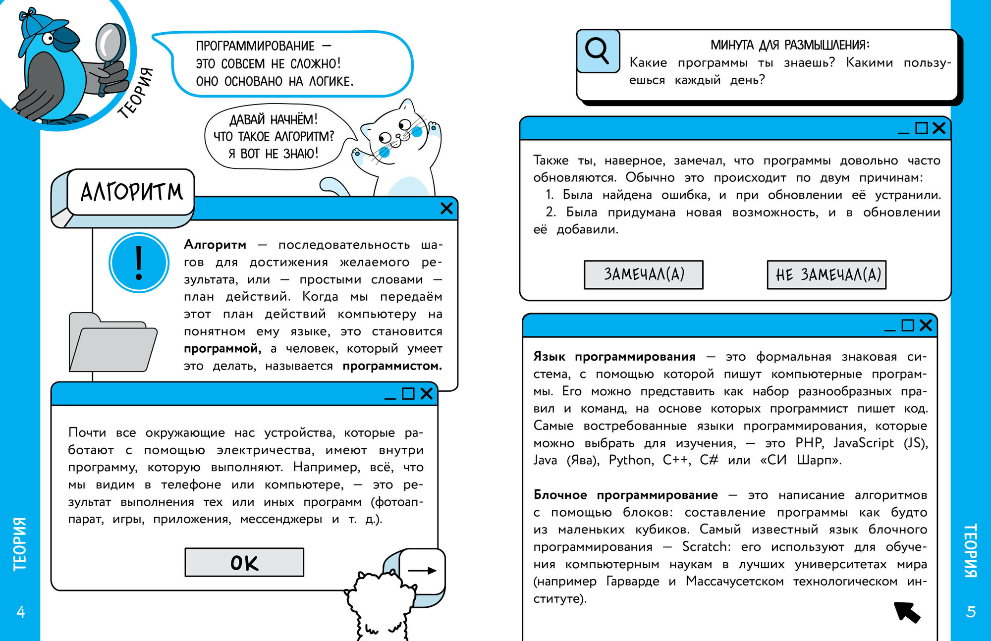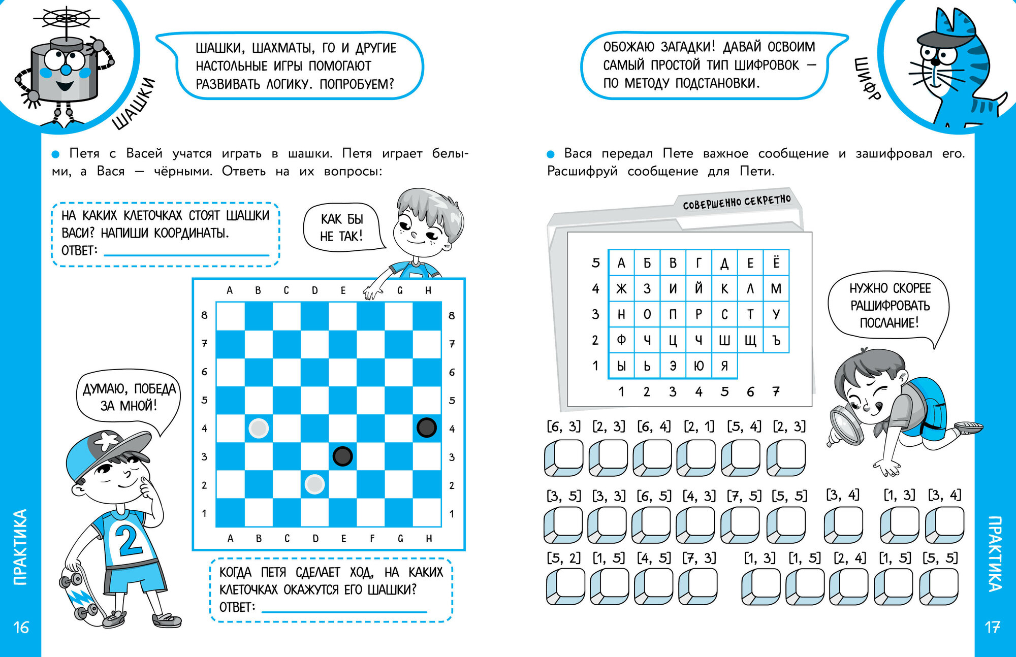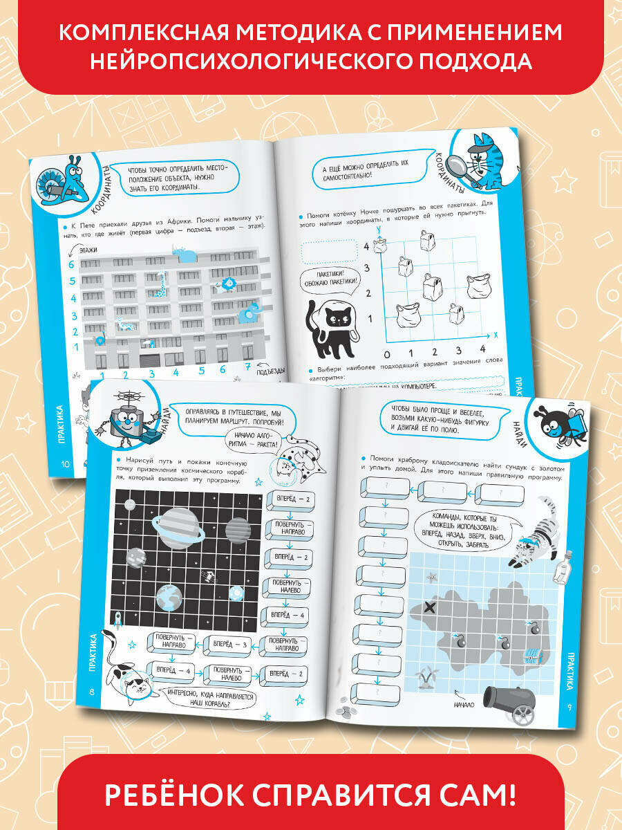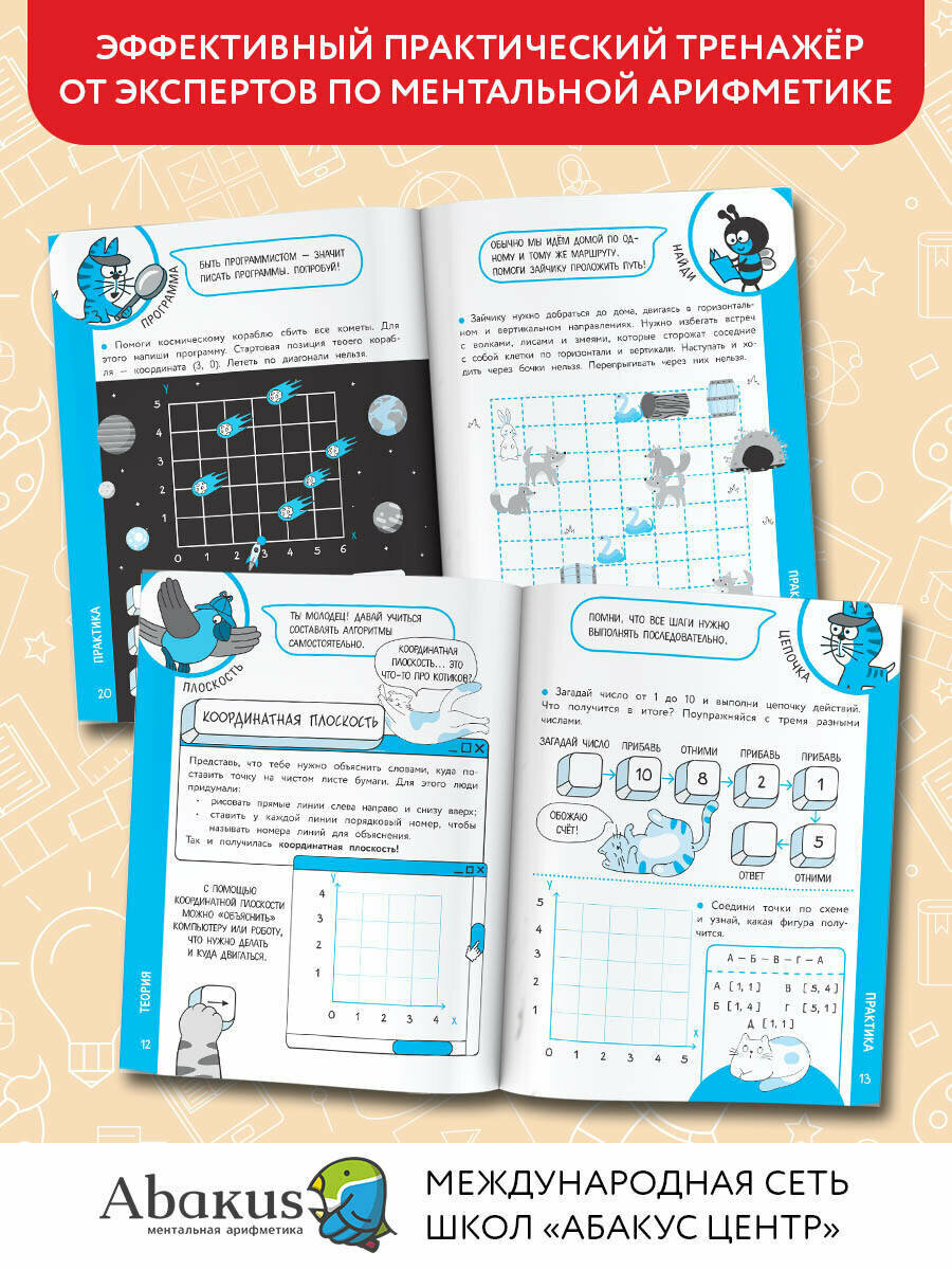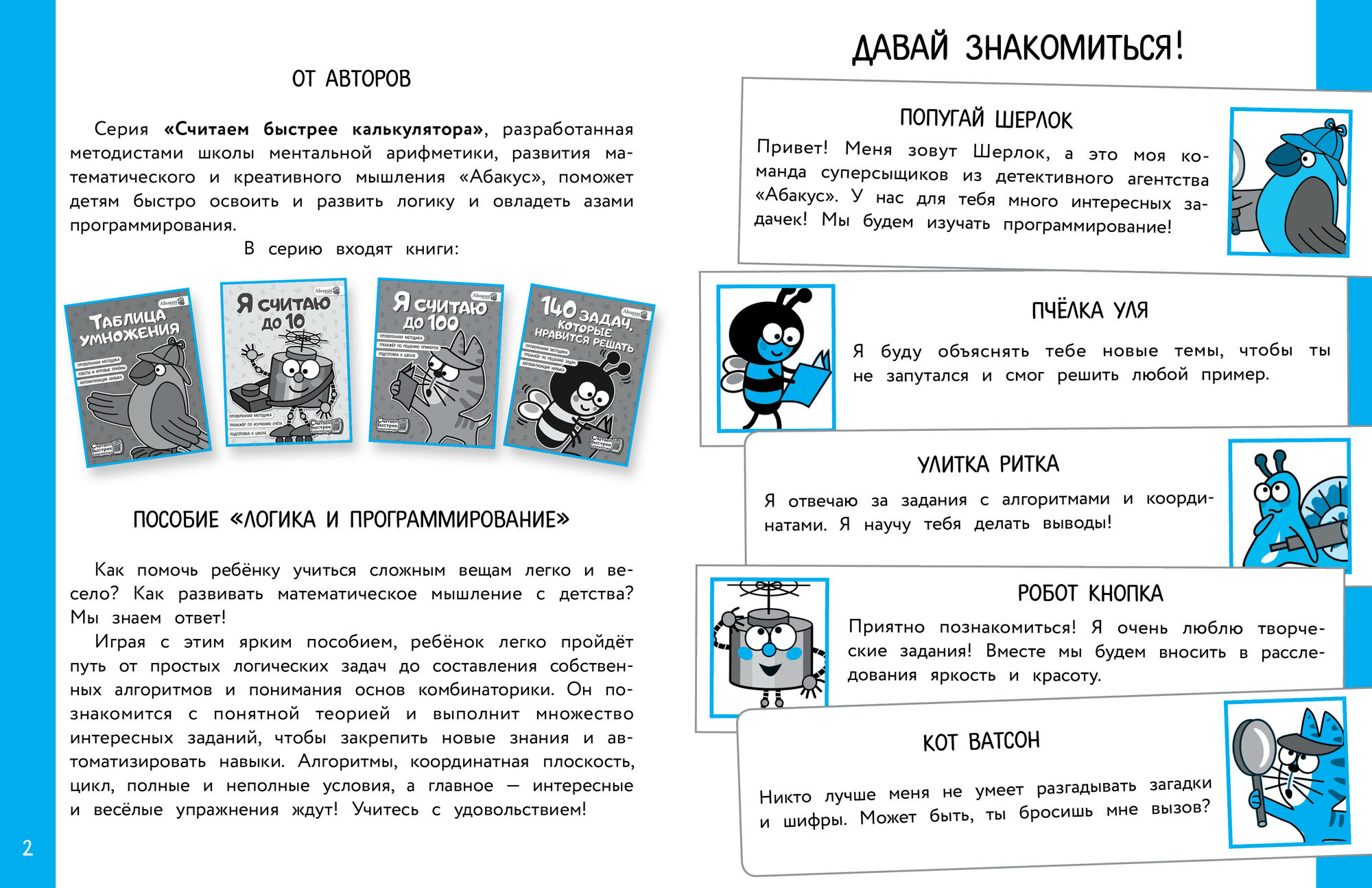Эта тетрадь поможет дошкольникам и ученикам начальной школы приобрести важнейшие навыки — освоить логику и основы программирования. Как помочь ребёнку сделать это легко и весело? Как развивать математическое мышление с детства? Мы знаем ответ! Играя с этим ярким пособием, ребёнок легко пройдёт путь от простых логических задач до составления собственных алгоритмов и понимания основ комбинаторики. Он познакомится с понятной теорией и выполнит 100 интересных заданий, чтобы закрепить новые знания и автоматизировать навыки. Алгоритмы, координатная плоскость, цикл, полные и неполные условия, а главное — интересные и весёлые упражнения ждут! Учитесь с удовольствием! Серия «Считаем быстрее калькулятора» — это комплекс занятий, разработанный методистами школы ментальной арифметики «Абакус». Он поможет детям быстро освоить и развить навыки математического мышления.