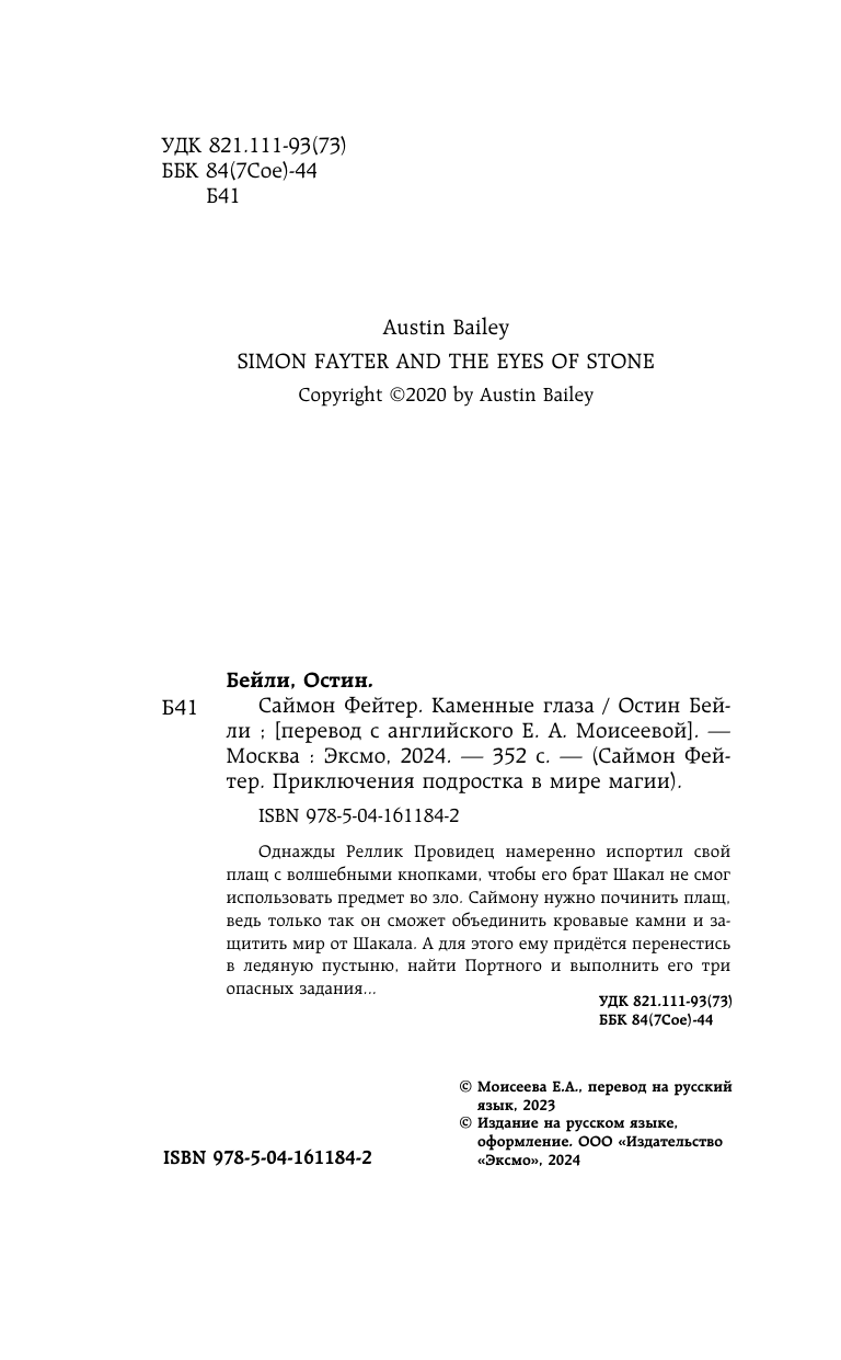 На сегодняшний день товар «Книга: Саймон Фейтер. Каменные глаза (#4) (Бейли Остин); ООО "Издательство "Эксмо", 2024» можно купить с кешбеком в 4 магазинах: book24, Буквоед, Читай-город, Яндекс.Маркет