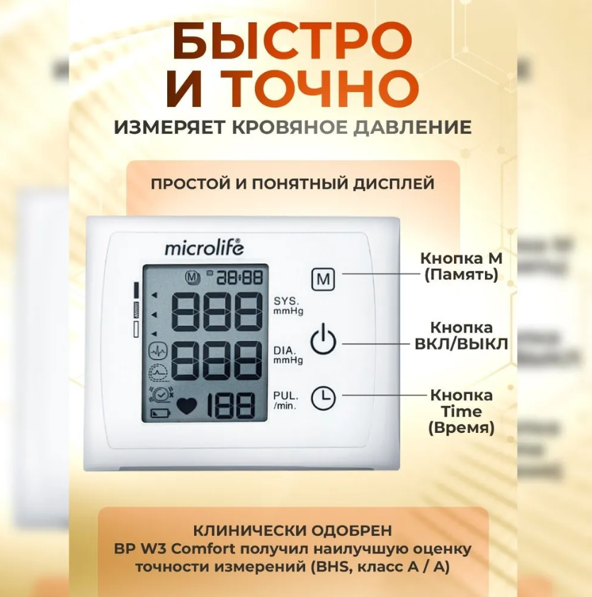Автоматический тонометр BP W3 Comfort на запястье позволяет быстро и точно измерять давление. Он клинически протестирован и имеет наивысшей класс точности A / A. Кроме того, устройство обнаруживает нерегулярное сердцебиение и уведомляет вас, отображая символ IHB на дисплее. Тонометр оснащен удобным футляром для хранения, идеально подходящим для транспортировки во время путешествий.Описание:технология Comfort+;технология IHB: ранее предупреждение о возможных сердечно-сосудистых аритмий;память на 30 измерений;классификатор результатов измерения;индикатор о правильном надевании манжеты;широкая манжета на запястье (13,5-23 см);среднее отображение всех сохраненных показаний;регулируемые время и дата;мягкое измерение во время нагнетания манжеты.Технические характеристики:размеры: 81x 65 x 21 мм;вес: 112 г (включая батарейки);источник напряжения: 2 щелочные батареи 1,5 В; размер AAA:диапазон измерения: 0 - 280 мм рт. ст. (артериальное давление) 40 - 200 ударов в минуту (пульс)Комплектация:тонометр BP W3 Comfort с увеличенной манжетой 13,5-23 см.;2 батарейки ААА;бокс для хранения;инструкция по эксплуатации на русском языке;гарантийный талон;товарная накладная