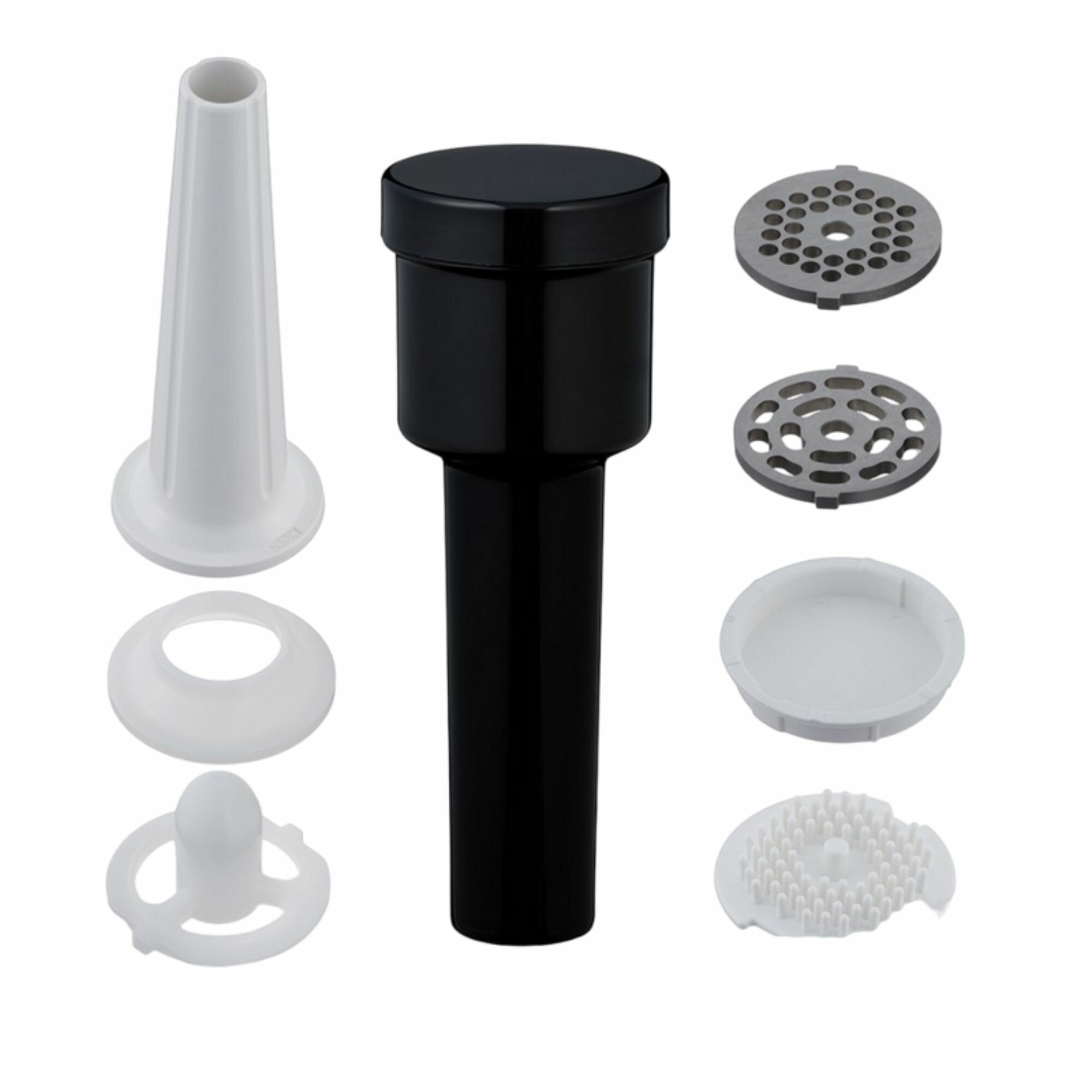 | Комплект поставки | Решетка с крупными отверстиями / Решетка со средними отверстиями / Решетка с мелкими отверстиями / Насадка Кеббе / Насадка для приготовления колбасок / Толкатель, он же футляр для хранения насадок / Нож / Загрузочный лоток / Щетка для очистки |
