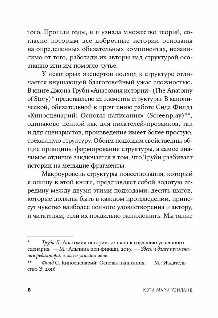 Подобно архитектору, проектирующему здание, автор крупной литературной формы движется от общего замысла к деталям. Так и в художественном произведении есть макроуровень, состоящий из десяти шагов, которые описывает Уэйланд. Далее автор последовательно останавливается на структуре сцены и предложения.