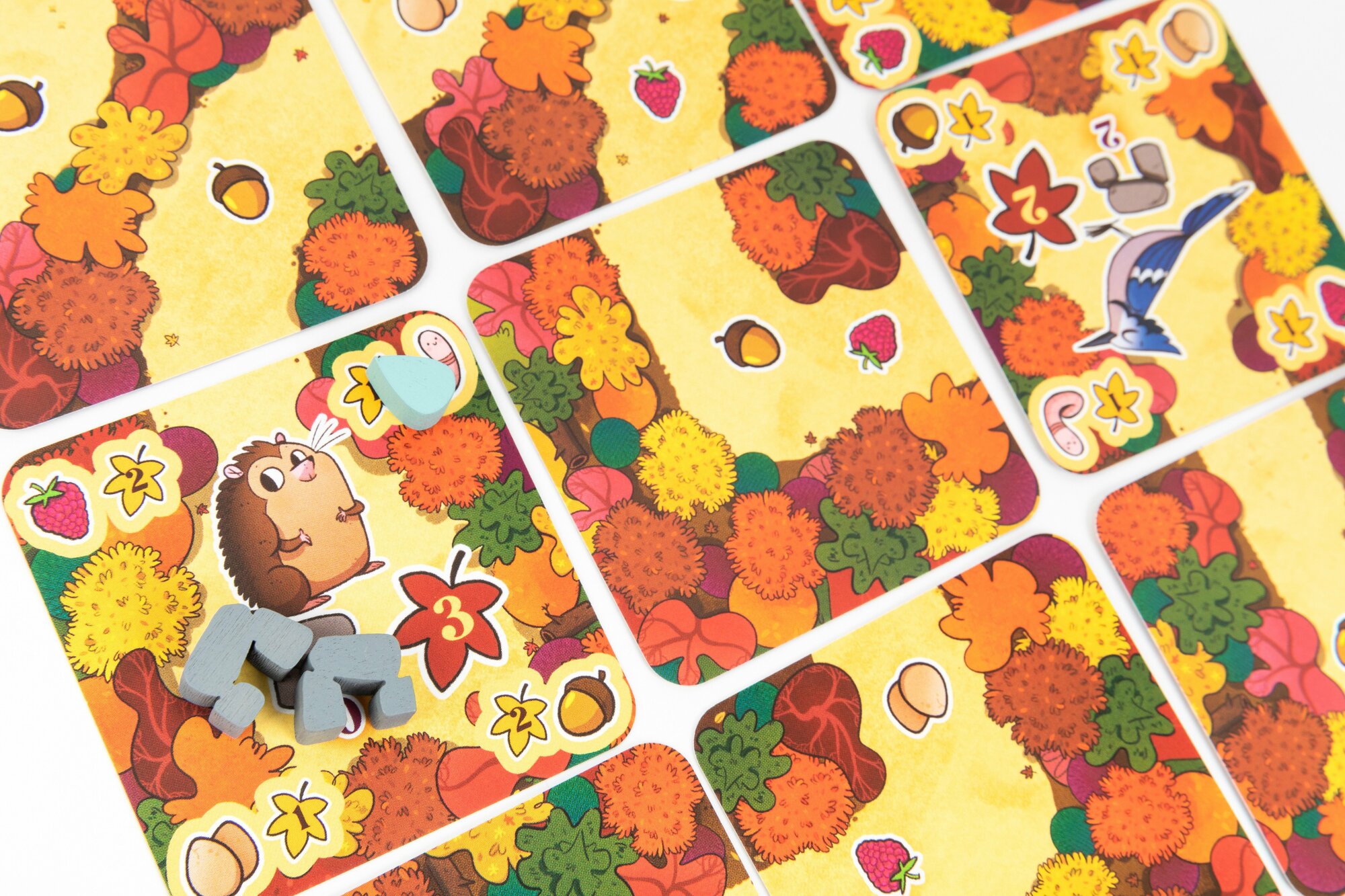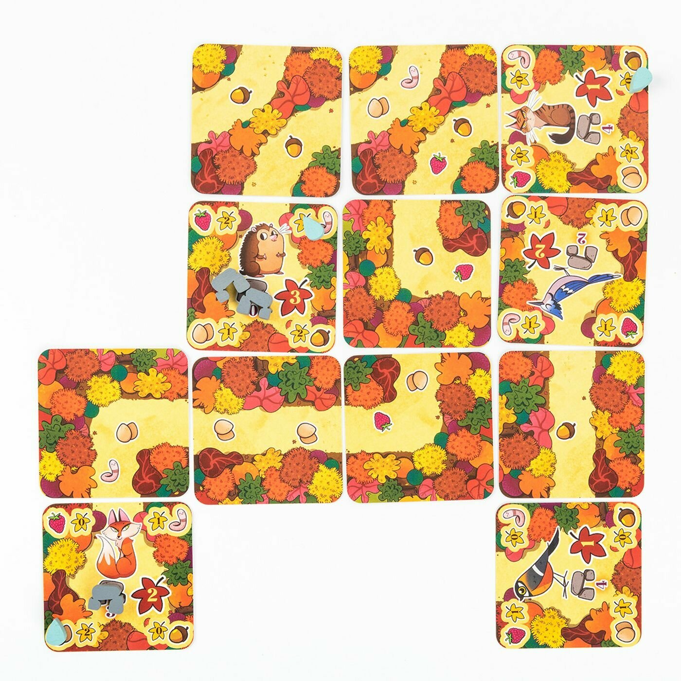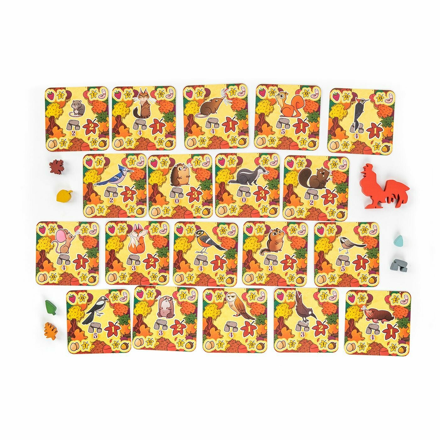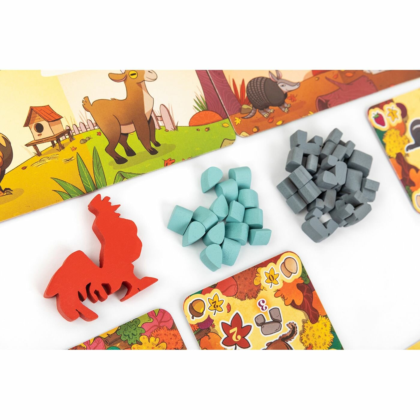 | Комплектация | 45 карточек тропинок, 19 карточек животных, 15 фишек нор, 15 фишек воды, 4 фишки для подсчёта победных очков, 2 части игрового поля, Фигурка первого игрока, Правила игры |