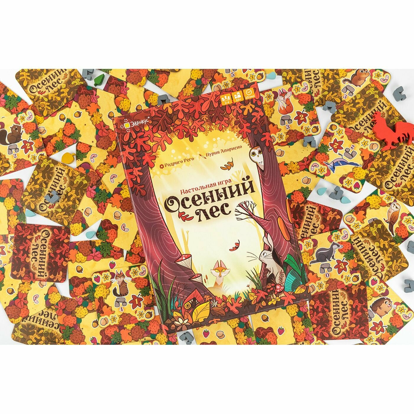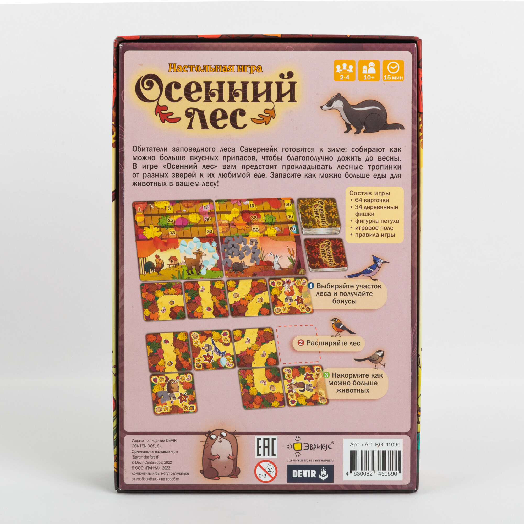 Осень в лесу Савернейк подходит к своему логическому завершению... Помогите животным запастись едой на зиму! Savernake forest предлагает игрокам построить свой собственный участок леса с дорожками, на которых появляются животные и еда. Чтобы получить максимальное количество очков, игроки должны сделать так, чтобы на каждой тропинке животные могли собрать свою любимую еду.Для всех любителей тактических карточных игр.Лисы, ежи, бобры, совы, кролики, дятлы, дикие кошки... 23 разнообразных вида животных живут вместе в лесу Савернейк. В конце осени все они готовятся встретить холодную зиму с достаточным запасом провизии, и здесь вы должны протянуть им руку помощи... Точнее лапу! Для игры в Savernake Forest у вас есть две колоды квадратных карт, на одной из которых изображены животные, а на другой лесные тропинки, полные сочных плодов. Каждый игрок наугад получает карту животного, на которой указано, сколько еды он может хранить и каковы его предпочтения. Например, лиса любит яйца, но не ягоды или орехи. Чтобы получить максимальный результат, нужно постараться заставить каждое животное собрать свои любимые лакомства.Во время подготовке к игре три карты дорог и одна карта животного выкладываются на видное место для всех игроков. Каждый игрок в свой ход выбирает одну из них и добавляет ее в свой лес, соблюдая при этом три правила: на одном пути никогда не может быть двух животных; карты должны быть соседними; карты нельзя размещать за пределами сетки 4x4. Игра заканчивается, когда все участники завершат свой лес, имея в общей сложности 16 карт.В течение всей игры игрокам будут помогать некоторые животные, в зависимости от того, какую карту они выберут на обще рынке. Петух поможет вам встать пораньше, чтобы вы могли первым выбрать карту в следующий ход. Броненосец научит вас рыть лучшие убежища, чтобы хранить больше еды. Вы можете взять жетон норы и добавить его к одной из своих карт животных, чтобы увеличить вместимость хранилища этого животного на 1. Коза научит вас лучше увлажнять себя, предлагая жетон капли воды, который может быть связан с едой и увеличить ее стоимость на 1. Наконец, кролик поможет вам привлечь новых животных в ваш лес.Для игроков, ищущих более сложные испытания, в книгу правил включен вариант для двух игроков с некоторыми изменениями, повышающими сложность. Хорошее подспорье, если вы уже освоили основные правила!