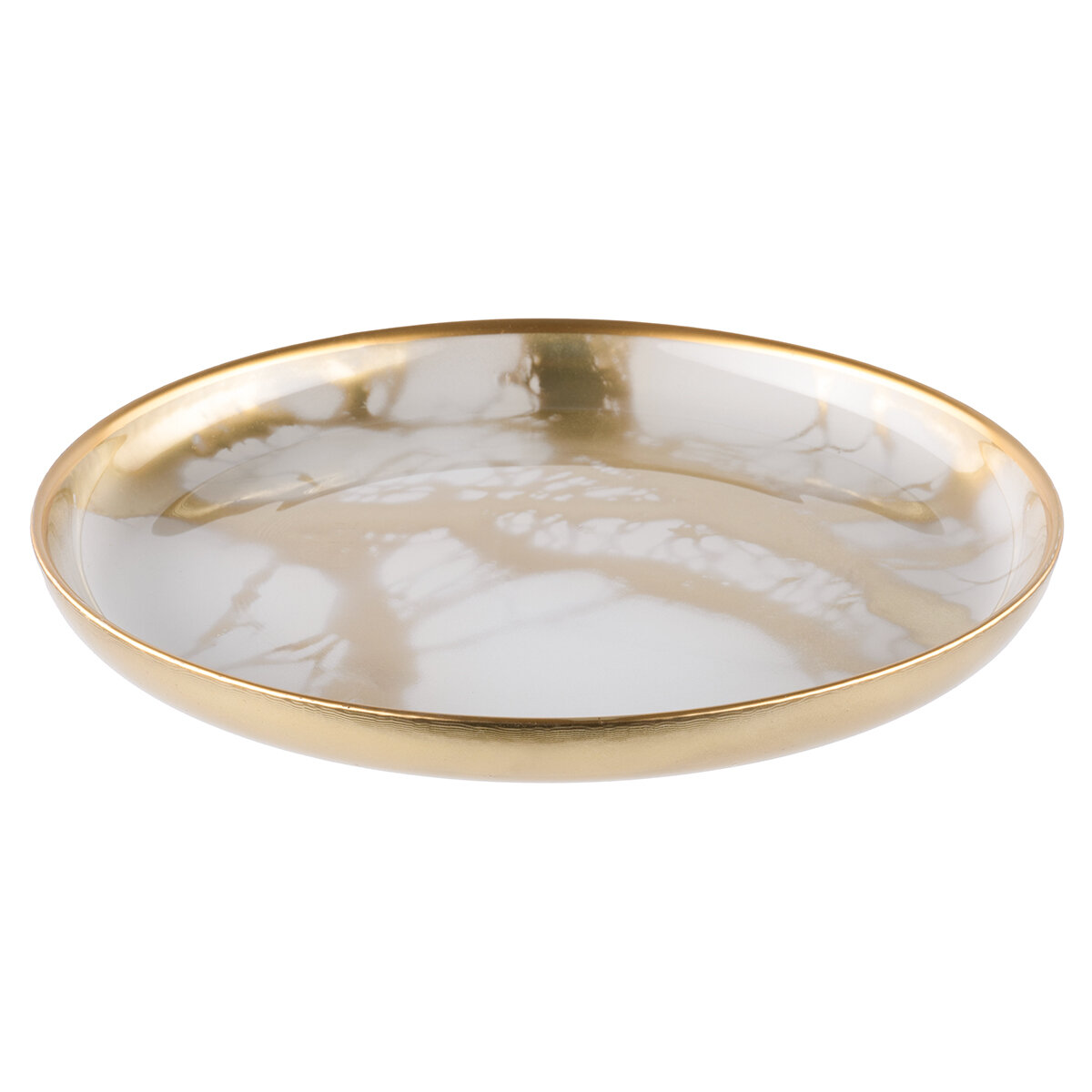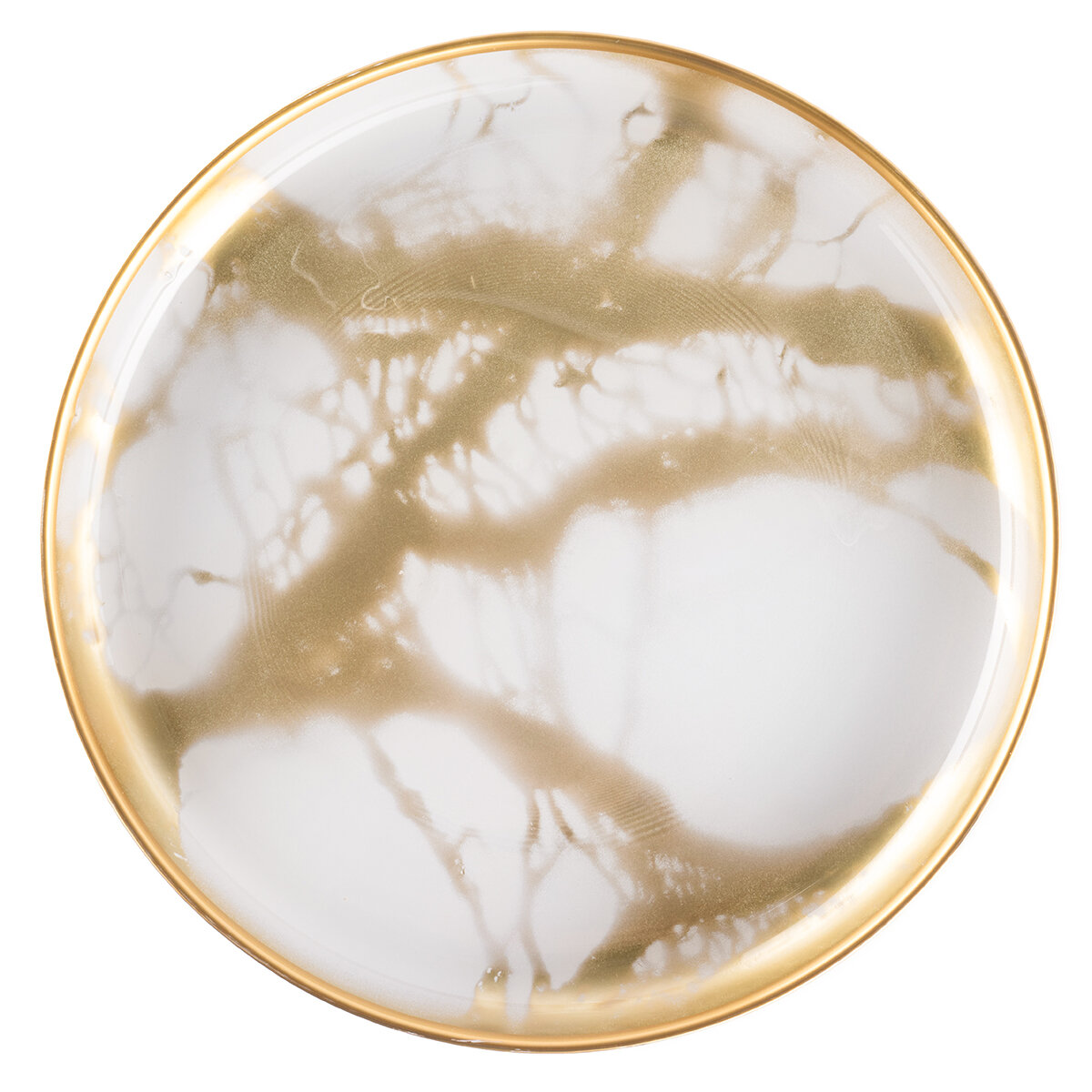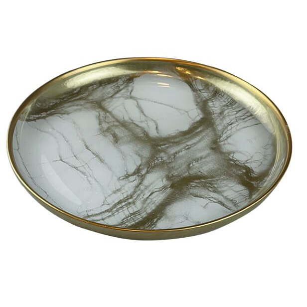 Тарелка выполнена в элегантном снежно-белом оттенке с золотистыми прожилками как из драгоценного мрамора.
