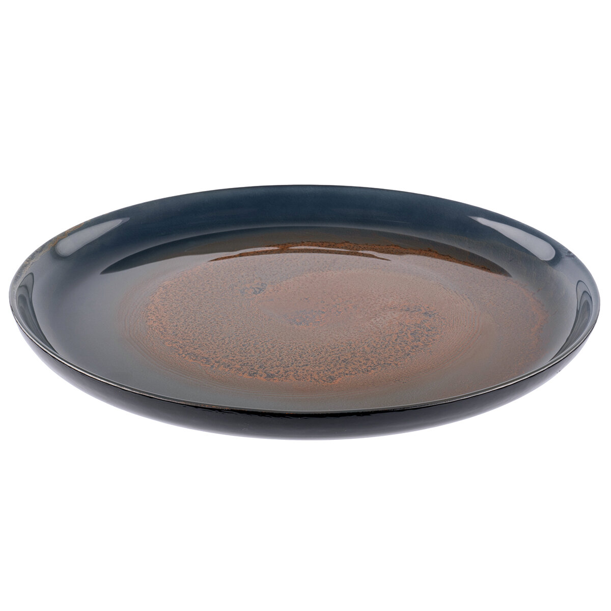 Тарелка выполнена с глянцевой поверхностью в удивительной палитре цветов: от изумрудно-зеленого, переходящего в янтарный, медовый и коричневые оттенки, дополненных акцентами синего, от нежно-голубых до индиго.