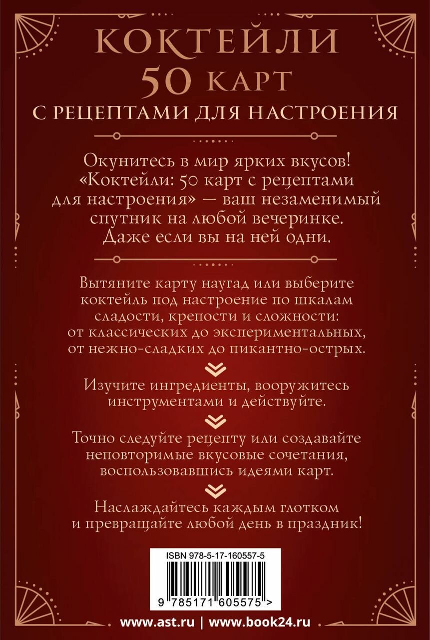 Окунитесь в мир ярких вкусов! "Коктейли: 50 рецептов для настроения" — ваш незаменимый спутник на любой вечеринке. Даже если вы на ней одни. 1. Вытяните карту наугад или выберите коктейль под настроение по шкалам сладости, крепости и сложности: от классических до экспериментальных, от нежно-сладких до пикантно-острых.2. Изучите ингредиенты, вооружитесь инструментами и действуйте.3. Точно следуйте рецепту или создавайте неповторимые вкусовые сочетания, воспользовавшись идеями карт.4. Наслаждайтесь каждым глотком и превращайте любой день в праздник!