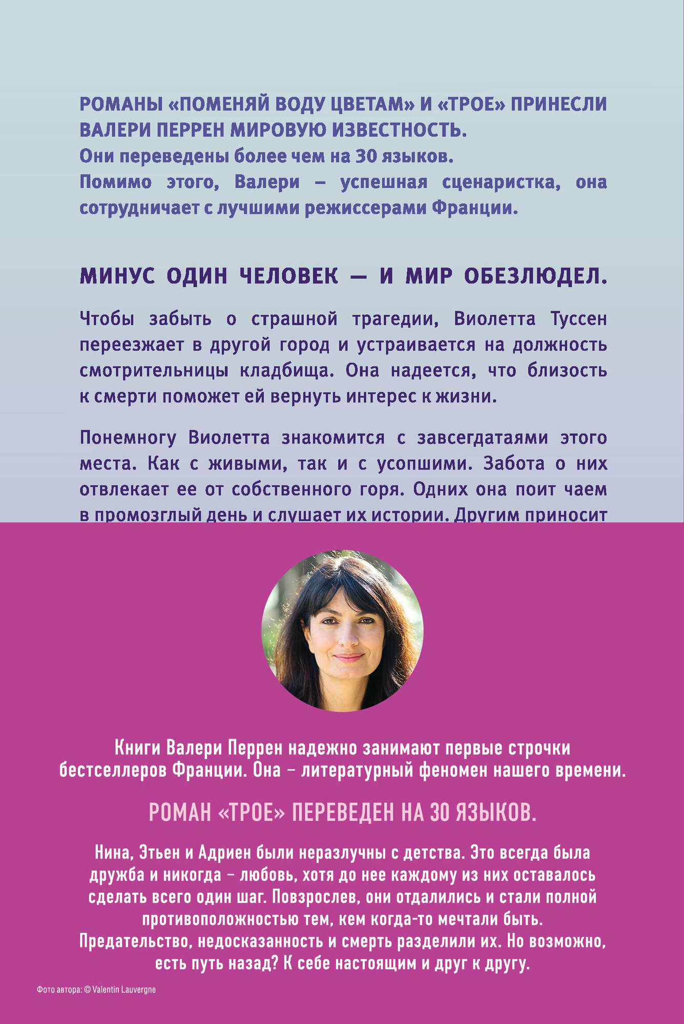 Валери Перрен родилась в 1967 году во французском городе Геньон. Сегодня она одна из главных французских писательниц современности. Ее книги надежно занимают первые строчки бестселлеров Франции. Валери Перрен – литературный феномен нашего времени.