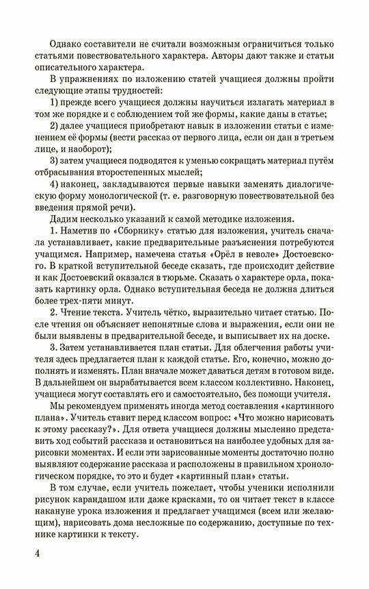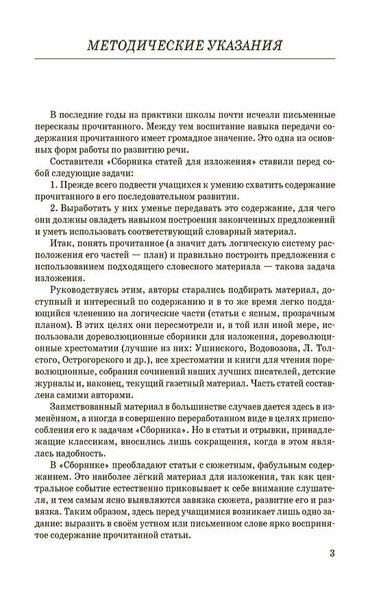 Статьи охватывают широкий спектр тем и стилей, от использования диалога до описательной письменности, а также включения личных наблюдений. Кроме самих текстов для изложения, после каждой статьи добавлен план с выделенными вопросами для пересказа. К некоторым статьям авторы рекомендуют задания для творческих пересказов, самостоятельных сочинений и словарной работы.