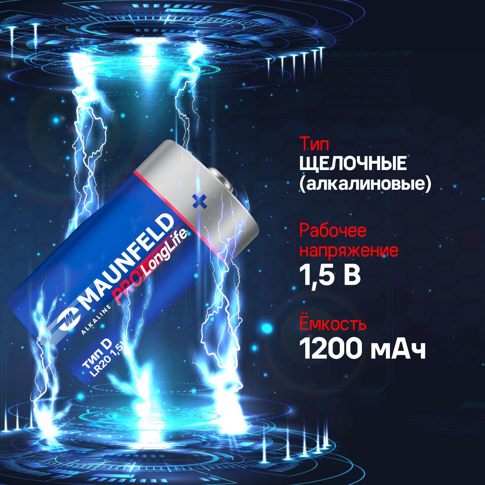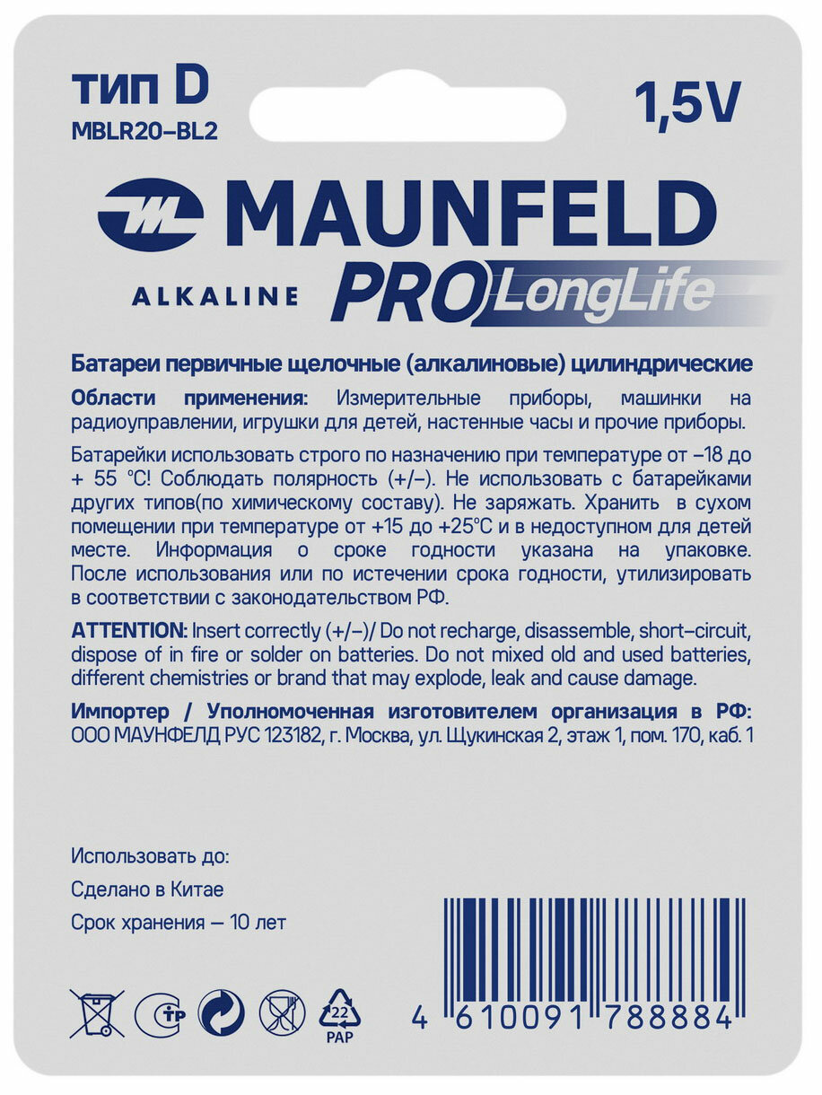 Батарейка MAUNFELD PRO Long Life Alkaline D(LR20) MBLR20-BL2, 2 шт