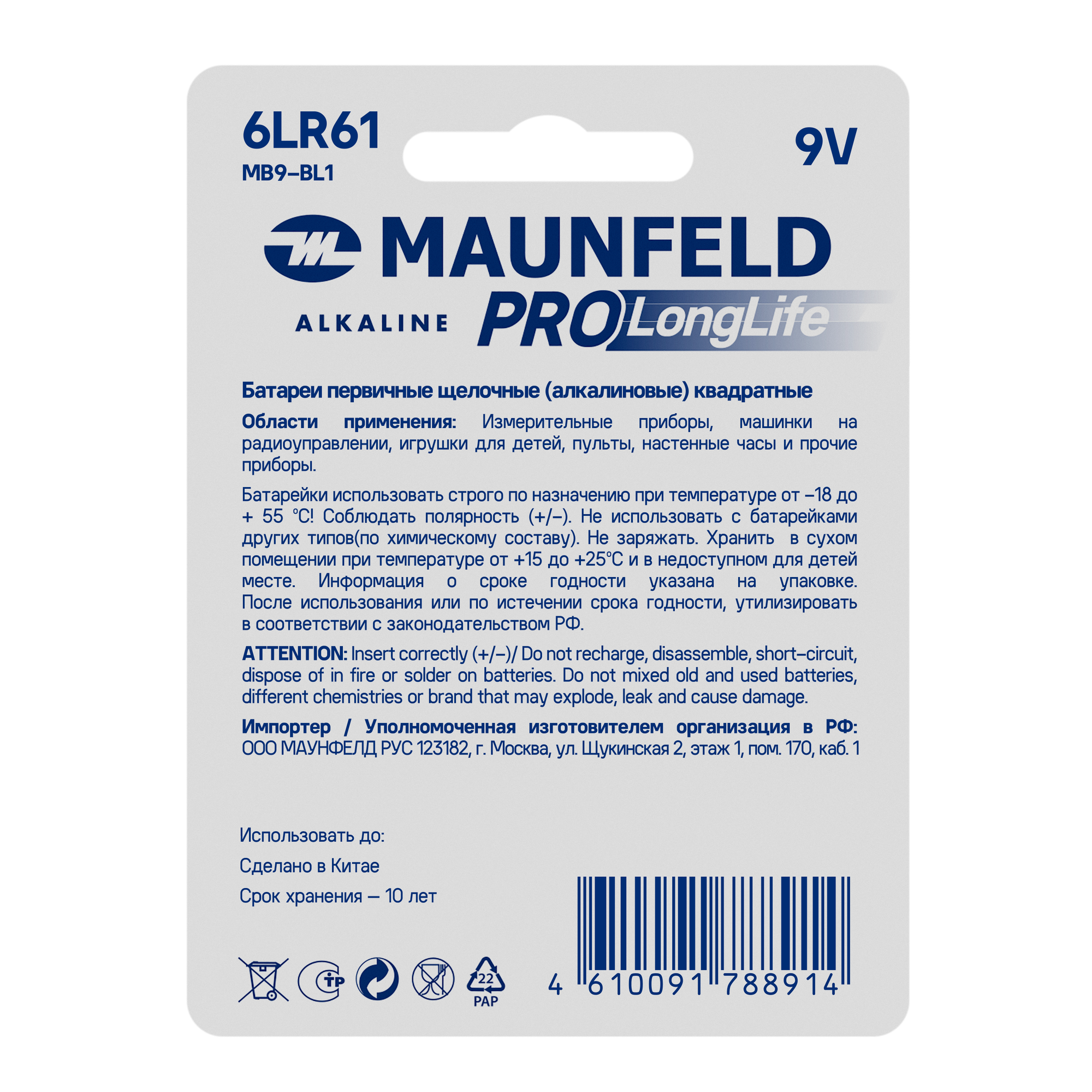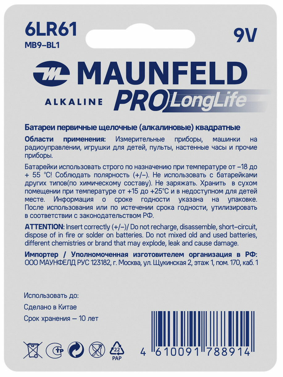Модель: PRO Long Life Alkaline 9V(6LR61) MB9-BL1