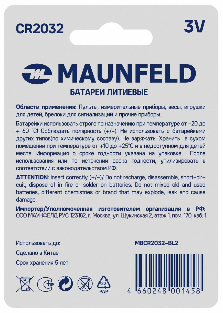 Батарейка MAUNFELD Lithium CR2032 MBCR2032-BL2, 2 шт