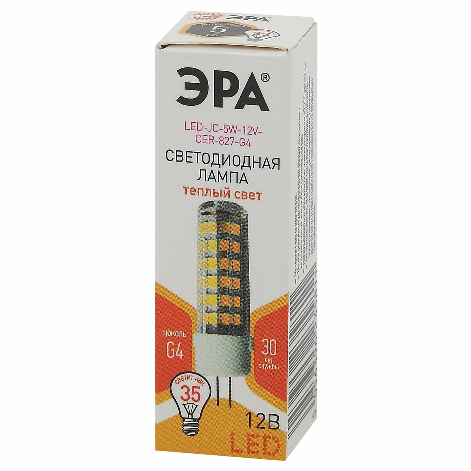Лампа светодиодная ЭРА LED JC-5W-12V-CER-827-G4 (диод капсула 5Вт тепл G4) (20/500/21000) Б0049087