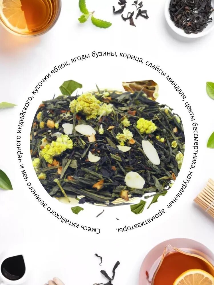 Смесь китайского зеленого чая Сенча и индийского черного чая Ассам с кусочками яблока и ягодами бузины. Букет дополнен лепестками миндаля, корицей и цветами бессмертника. Свежий, легкий, очень приятный вкус с ароматом яблочного штруделя.