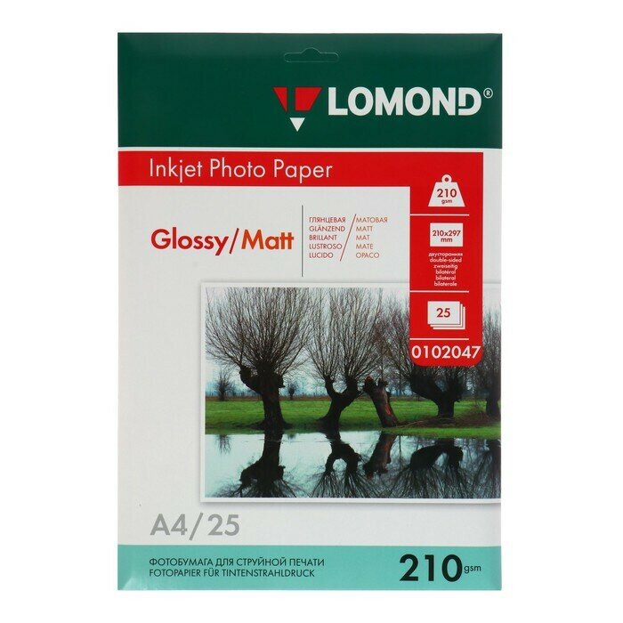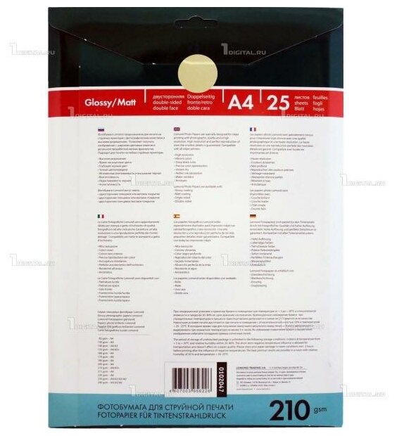 Лицевая сторона: Глянцевая. Обратная сторона: Матовая. Формат A4 (210 x 297 мм.), Плотость 210 г/м2. 25 листов.Для струйной печати. Водорастворимые чернила. Максимальное разрешение печати 2880 dpi. При печати текстов и схем с мелкими деталями глянец может мешать восприятию. В то же время, двухсторонние рекламные листки и проспекты часто должны содержать текстово-гафическую информацию. Для этих целей предназначены глянцево-матовые бумаги. На глянцевой стороне печатается яркая броская картинка или фото, а на матовой – более детальная, точная информация, которая должна удерживать внимание в течение некоторого времени, не утомляя глаз.