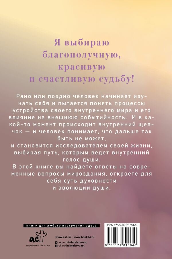 Я выбираю благополучную, красивую и счастливую судьбу! Рано или поздно человек начинает изучать себя и пытается понять процессы устройства своего внутреннего мира и его влияние на внешнюю событийность. И в какой-то момент происходит внутренний щелчок — и человек понимает, что дальше так быть не может, и становится исследователем своей жизни, выбирая путь, которым ведет в нутренний голос души. В этой книге вы найд ете ответы на современные вопросы мироз дания, откроете для себя с уть духовности и эволюции души.