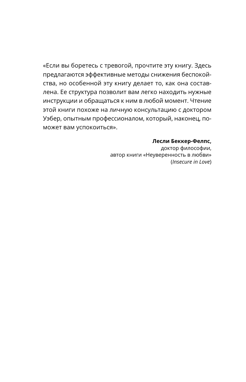 Управляйте тревогой ? в любое время и в любом месте ? с помощью простых эффективных стратегий. Если вы страдаете от тревожности, то знаете, что симптомы могут проявиться в любое время и в любом месте. Но хорошая новость, что вы не одиноки. Джилл Уэбер, клинический психолог и специалист по терапии тревожных состояний, написала книгу «По ту сторону тревоги. Техники управления настроением и борьбы с навязчивыми состояниями», чтобы помочь вам и миллиону других людей разобраться с этой проблемой. Она использует передовые методы, которые помогают уменьшить тревогу за короткий срок. Эта книга не только научит управлять стрессом, но и поможет найти причины беспокойства, чтобы обрубить тревогу на корню. Стратегии, основанные на исследованиях и фактах, показывают, как контролировать множество симптомов в самых разных обстоятельствах. Особая ценность книги: • Уникальный и эффективный подход, проверенные стратегии, чтобы справиться с тревогой на месте в любой ситуации, а также интерактивные техники, которые выводят вас на новый уровень самопомощи. • Передовые методы избавления от тревоги отражают последние исследования и достижения психологии. • Удобная структура позволяет сразу найти то, что для вас наиболее важно. Автор рекомендует: • Измените тон внутреннего диалога на более мягкий и сострадательный. • Замените тревожные и пессимистичные мысли на реалистичные. • Выйдите в мир, проверьте свои ожидания и посмотрите, оправдались ли они.