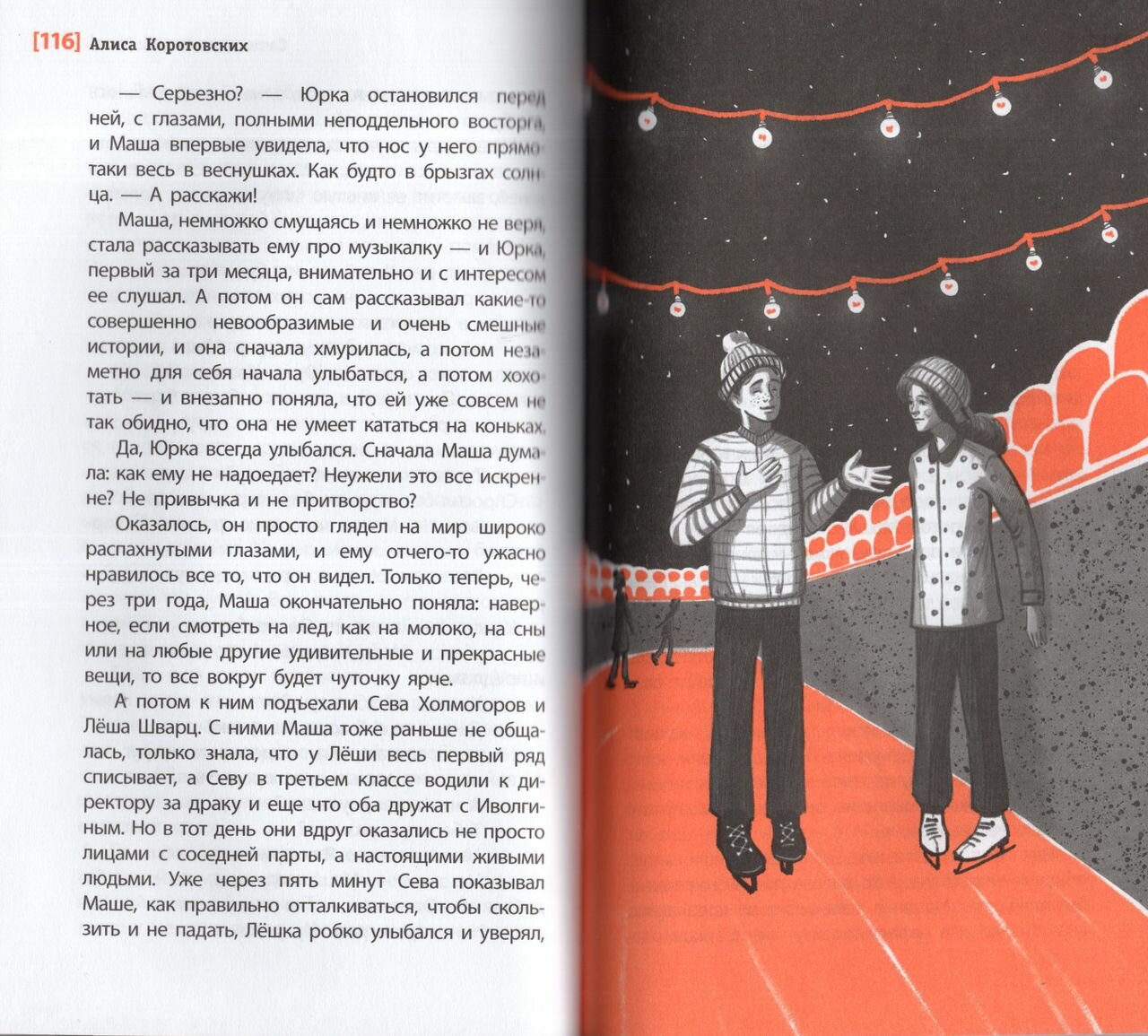Где проходит та черта, которая разделяет детство и взрослую жизнь? В повести Алисы Коротовских таким водоразделом оказалось лето между 7-м и 8-м классами. Маше как-то вдруг, неожиданно стали малы любимые качели, а еще с ней «случился» Питер («Нет, нет, нет. Лучше не думать об этом!»). Сева неуловимо изменившимся вернулся из Лукьяновского, а Лёшка — с моря, из лагеря для одаренных детей. И только Юрка остался прежним — улыбчивым, добрым, искренним Юркой. Но остался ли?.. Изменилась и Мила, Людмила Сергеевна, их классная. Она как будто выцвела, разучилась улыбаться… И теперь, вопреки собственным убеждениям, требует писать сочинения по шаблону. Но в этот шаблон не умещается вся та жизнь, которая быстрым потоком несется вперед. Ох, какие сложные вопросы приходится решать в этой новой, взрослой жизни! Как справиться со всеми теми мыслями, порывами, научиться чувствовать эти взрослые чувства? Для среднего и старшего школьного возраста.