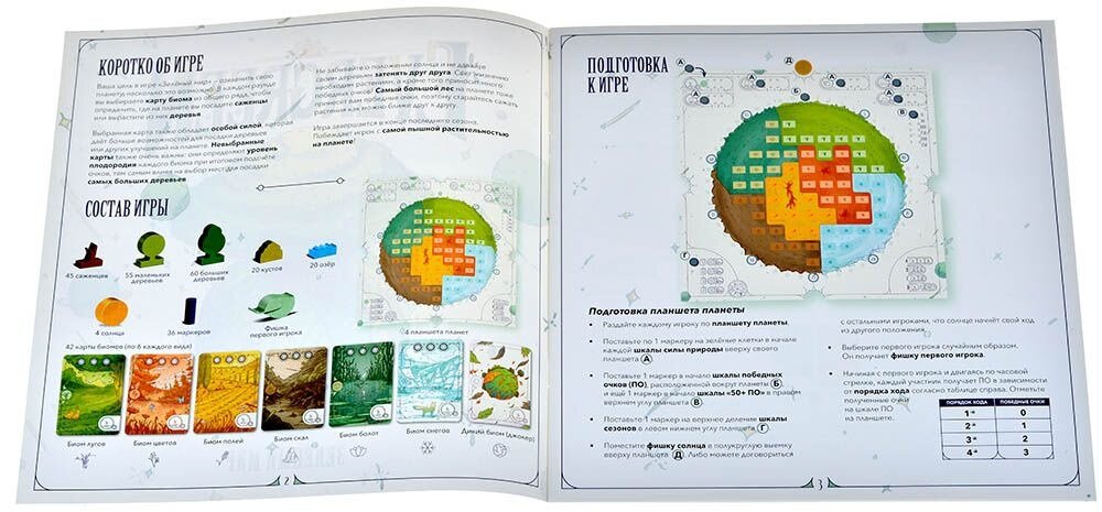 «Зелёный мир» - красивая стратегия, в которой вы должны построить на своей планете наиболее эффективную экосистему. Выращивайте леса, превращая саженцы в большие деревья. Заботьтесь о том, чтобы деревья получали достаточно солнечного света и росли на плодородной почве.Вы выбираете карты биомов из общего ряда, чтобы определить, где на вашей планете появятся саженцы или будут выращены деревья в этом раунде. Невыбранные карты не менее важны, так как влияют на плодородие соответствующих биомов. Чтобы создать огромный лес, вам нужно выращивать деревья, сажать кусты и размещать озёра, используя при этом силы природы для получения дополнительных действий. В идеале вы стремитесь сосредоточить свои деревья в наиболее плодородных биомах, но так, чтобы они не затеняли друг друга, ведь свет жизненно необходим растениям и приносит много победных очков.«Зелёный мир» продолжается в течение 14 раундов, разделённых на четыре сезона. Каждый сезон солнце будет освещать вашу планету с одной из четырёх сторон. Раундов становится меньше при каждой смене сезонов. Вы начинаете с пяти раундов весной, а зимой у вас будет только два раунда для завершения игры.Игра завершается по окончании последнего сезона. К итоговому счёту добавляются ПО за большие деревья в плодородных биомах на вашей планете. Победителем игры становится участник, который набрал больше всего победных очков!Режим одиночной игры позволяет вам сыграть против соперника-бота, который не озеленяет свою планету, а просто убирает карты из общего ряда, чтобы у вас был более интересный выбор даже при отсутствии реальных игроков. Основные правила игры остаются теми же, кроме некоторых изменений в фазе выбора.